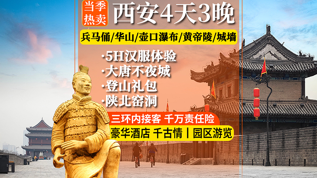 2、兵马俑+华清宫(华清池+骊山一票通)+大慈恩寺+城墙+壶口瀑布+黄帝陵轩辕庙+华山;