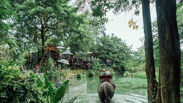 坐在郁郁葱葱的大自然丛林间,喝上一杯香浓的咖啡或享受美味的康拓宽午餐,看一场精彩的表演,和可爱的大象来一场亲密的互动,在漂亮的打卡点拍出圈大片。