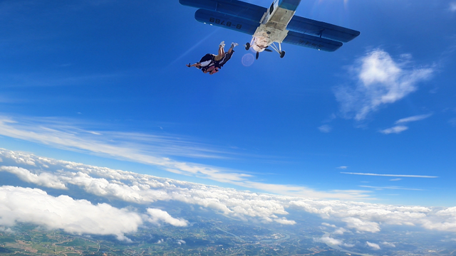 第4步:出舱。到达指定高度后,飞行员会配合跳伞教练选择合适的出舱位置,然后教练带着你一起用帅的姿势飞出去。
