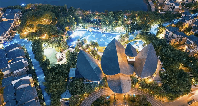以新东南亚建筑风格来打造,围绕千亩的宝墩湖而建的别墅群体