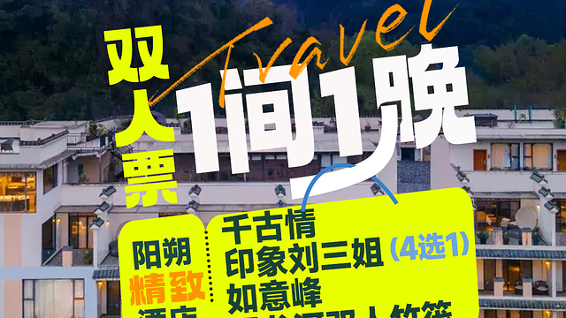 【费用包含】此套餐适用于2成人,所选房型1天1晚,阳朔精品酒店多选1住宿1间1晚+双人印象刘三姐演出票/双人桂林千古情演出票/如意峰索道/遇龙河双人筏。