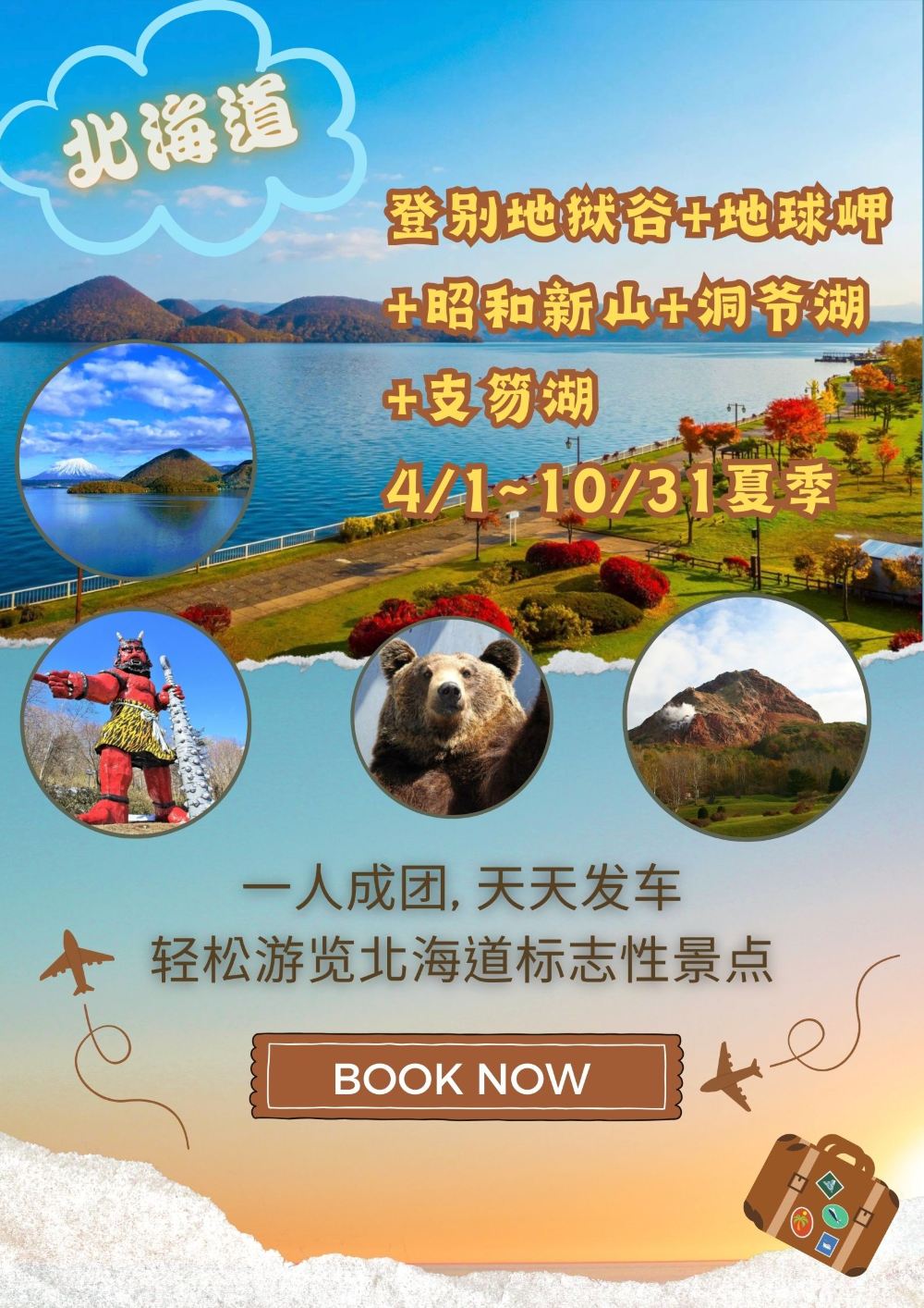 日本北海道登别地狱谷+洞爷湖+支笏湖一日游【一人成团】【亲临登别地狱谷,感受温泉喷涌的壮丽奇观!】