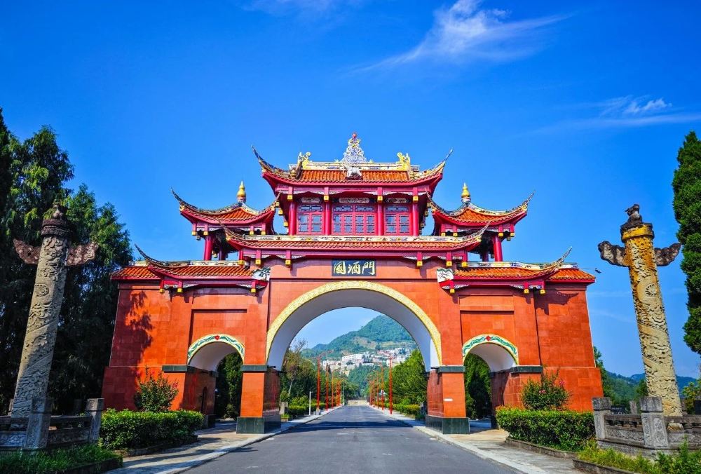▲ 国酒门:中国古典城楼式建筑,一殿三门、两亭四重檐,庄重华丽,象征着国酒茅台源远流长的历史和享誉海内外高贵典雅的气质。是贵州仁怀市茅台镇的镇大门。