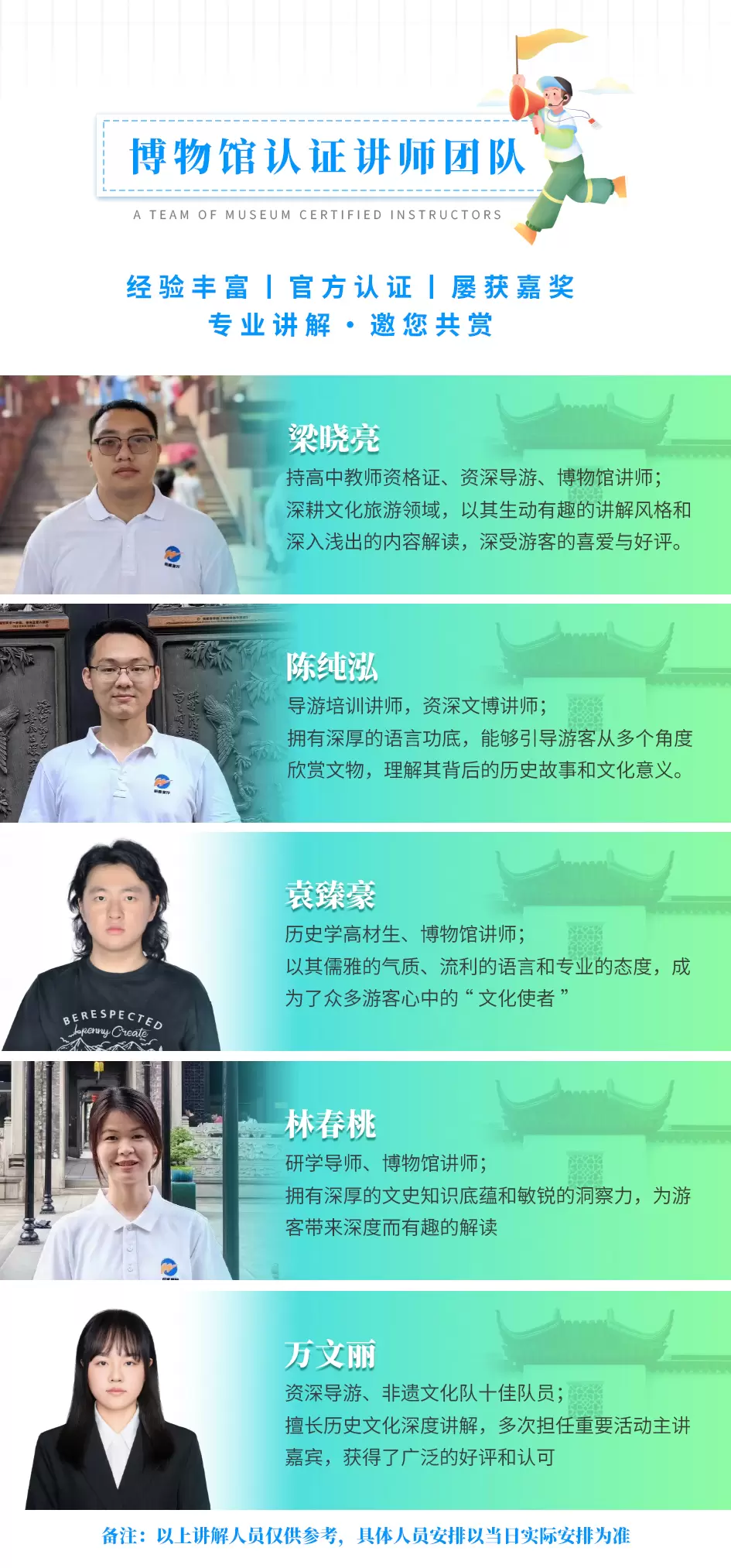 以上套餐所有景点都不固定时间点入园,讲解可到达景点后与当天整点的散客场拼团使用