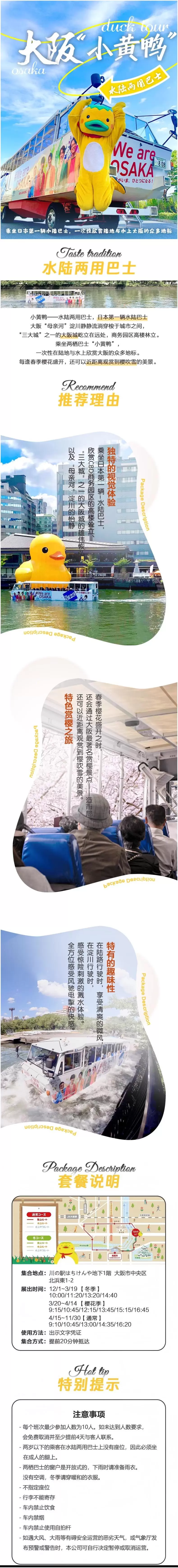 这辆色彩鲜艳的小黄鸭巴士是大阪的标志性观光项目之一,也是日本首创的水陆两用巴士体验。它高3.7米、长12米,重达10吨,外观超萌,行驶在街头时绝对是吸睛利器,巴士没有窗户,你可以尽情享受迎面而来的微风,感受四季的变换。