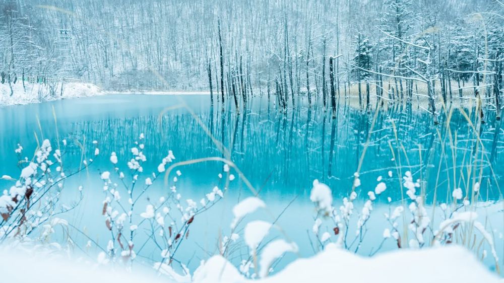 ▲ 白金青池, 美瑛地区知名观光景点,是防灾工程中意外形成的人造湖。湖水呈鲜明蓝色,“美瑛蓝” 随季节、时段、天候变化,搭配周围葱郁绿意和落叶松枯木,宛如童话世界。
