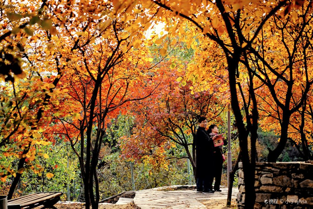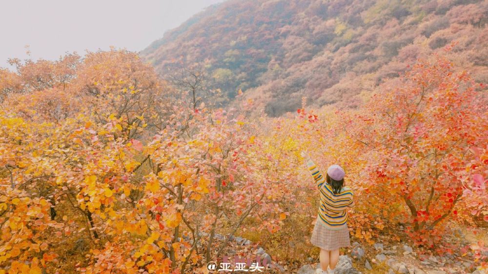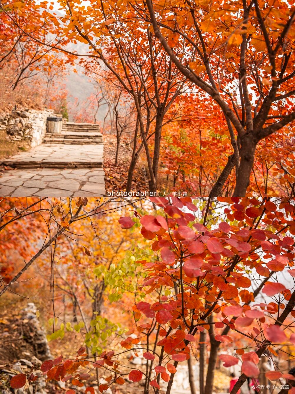- 10:00|到达徒步起点,在领队带领下开始穿越。我们跟随领队一路领略连绵不断的群山峻岭,我们一路赏红叶拍照。漫步在碎石小路中,红叶随行,连绵起伏的山峦上,橙黄红绿,煞是好看。沿路看秋,叶比花娇,居高远眺,目光所及尽是惊喜。不同树种的叶子,红黄交错,视觉由远及近,颜色由黄绿相间转向浓红淡黄,迥然不同的色彩,放眼望去层峦迭嶂红叶漫山……
