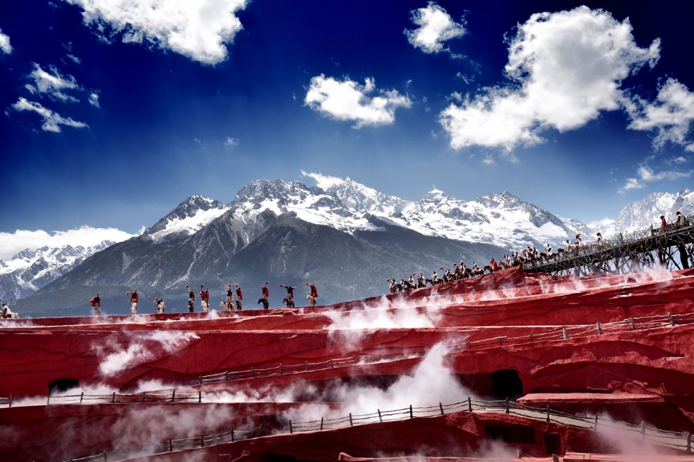 ▲ 印象丽江,由张艺谋导演的大型露天实景演出。 演出场地位于海拔3100米的甘海子,以雪山为背景,蓝天为幕布,由来自当地少数民族的非专业演员出演,场面宏大,极具民族风情和心灵震撼力。