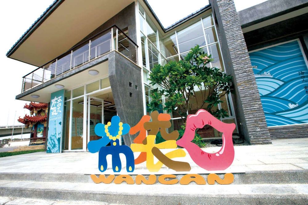 ▲ 布袋五四三故事館門口有著「布袋嘴」裝置藝術,布袋嘴就是布袋的舊地名,而故事館前身是「財政部高雄關稅局布袋留置所」,當地人俗稱「海關」,現以藝術策展展現過去布袋的歷史變化及人文風情,以創新又有趣的方式讓遊客深入瞭解布袋。故事館一樓以畫作展現布袋400年的歷史變化,一張畫作即代表一個殖民時期,分別為台灣史前時期、荷鄭時期、清領時期、日治時期、台灣光復後時期,其中光復初期布袋與中國海運發達,而有了「布袋小上海」的稱號。