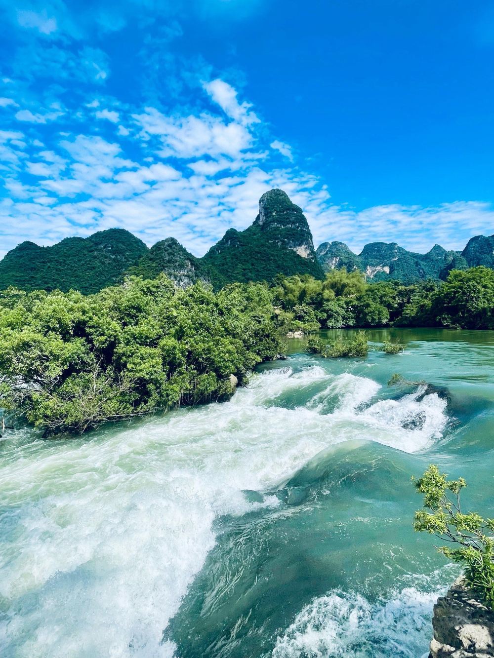 ▲ “亚洲第1跨国瀑布”名不虚传,三级跌落的水势如万马奔腾,竹筏漂流时还能远眺越南风光,水雾中常有彩虹乍现。