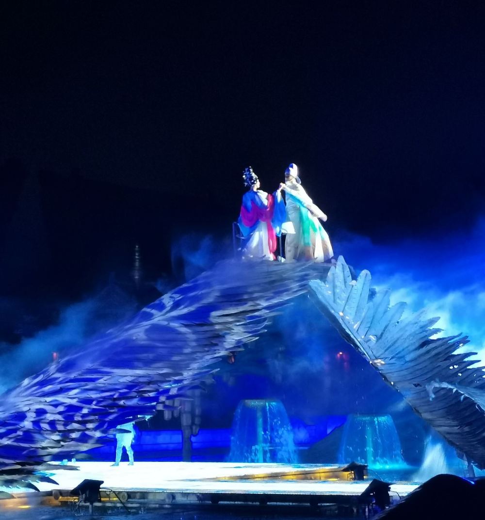《长恨歌》的演出地点就在华清池景区内。天色渐暗时,水中升起舞台,空中架起鹊桥,如梦似幻的场景让人恍若梦回大唐。