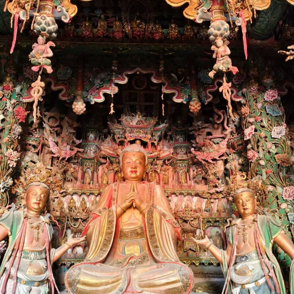 ▲ 小西天,原名千佛庵,由东明禅师始建于明崇祯二年(1629年),后因“重门”门额题有“道入西天”,且为区别于城南的明代寺院“大西天”,而更名为小西天。大雄宝殿是小西天的精华所在,为悬山顶式建筑,上覆琉璃瓦。殿内有上千尊明代彩塑,以五个世界佛为主题依次展开,除佛坛上的5尊主像外,墙壁、檩柱甚至屋椽之上皆有彩塑,姿态各异,造型生动。无梁殿则采用纯砖石拱券结构,不设梁柱,展现了明代高超的建筑技艺。