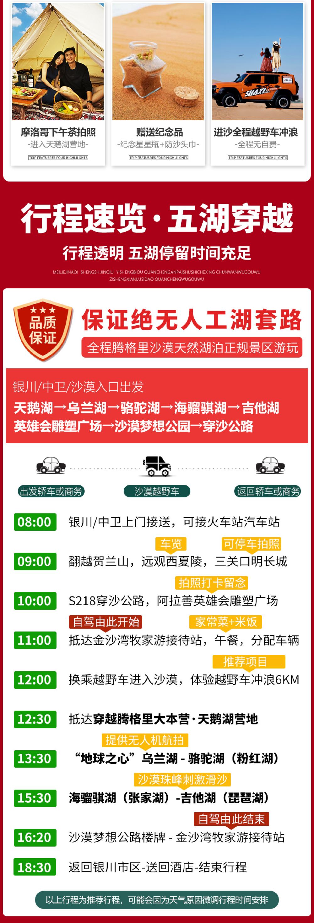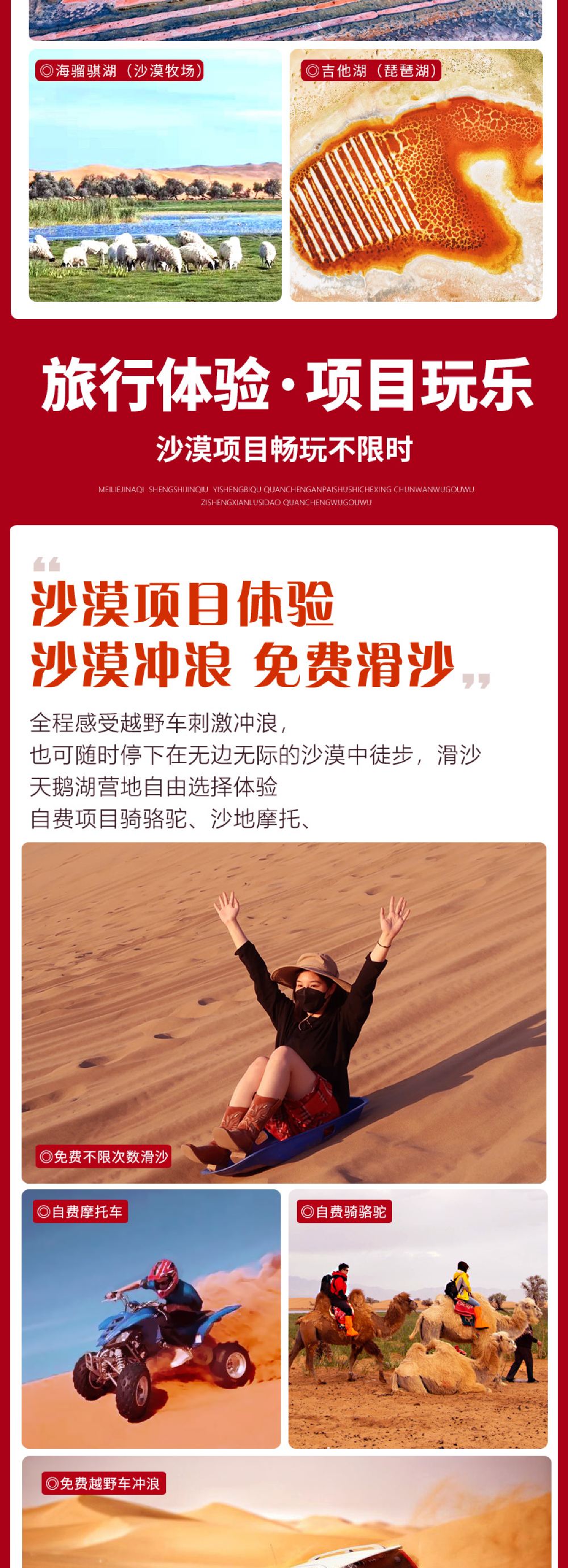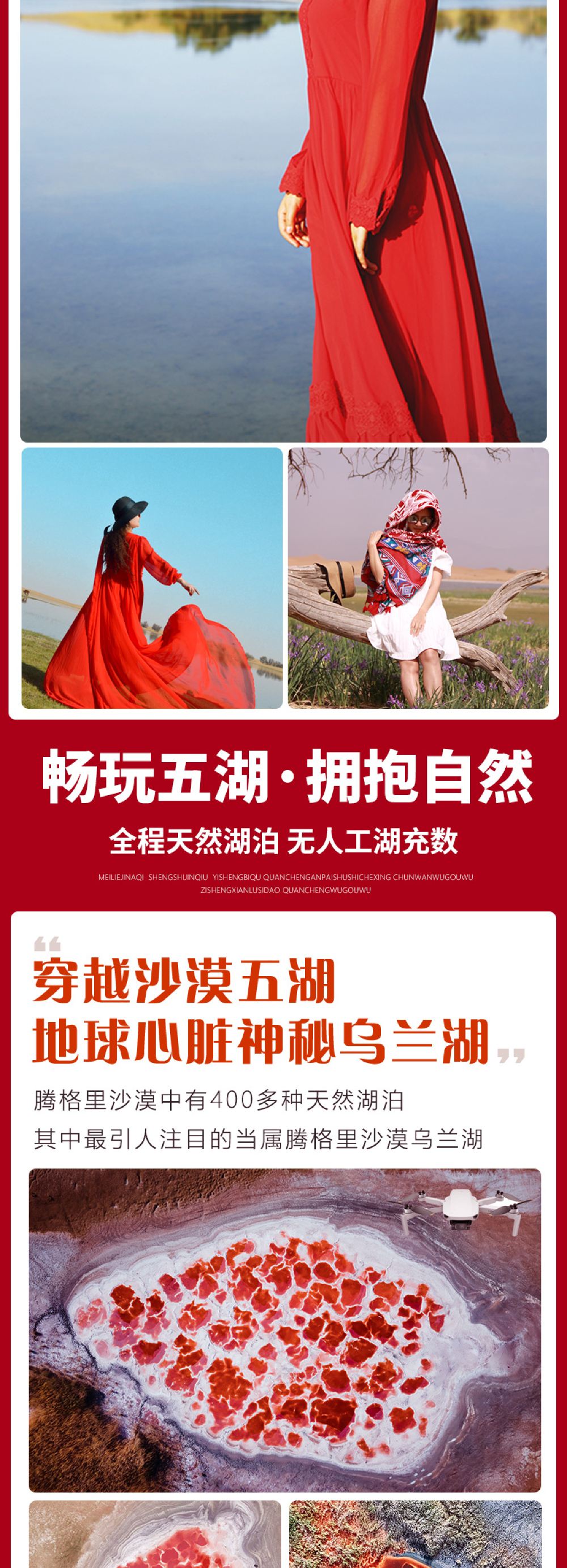 【五湖穿越】腾格里沙漠+乌兰湖【赠送乌兰湖航拍+下午茶摆拍】【[体验丰富]越野冲浪+无限滑沙+网红下午茶红裙摆柏、沙漠绿洲小众秘境,是一场视觉与肾上腺素的双重冒险】