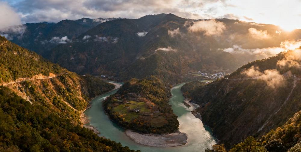 ▲ 它是万里长江从青藏高原奔腾而下,与澜沧江、怒江一起形成“三江并流”景观后,在石鼓村被山崖阻挡,突然来了个100多度的急转弯,转向东北,形成的罕见“V”字形大弯。