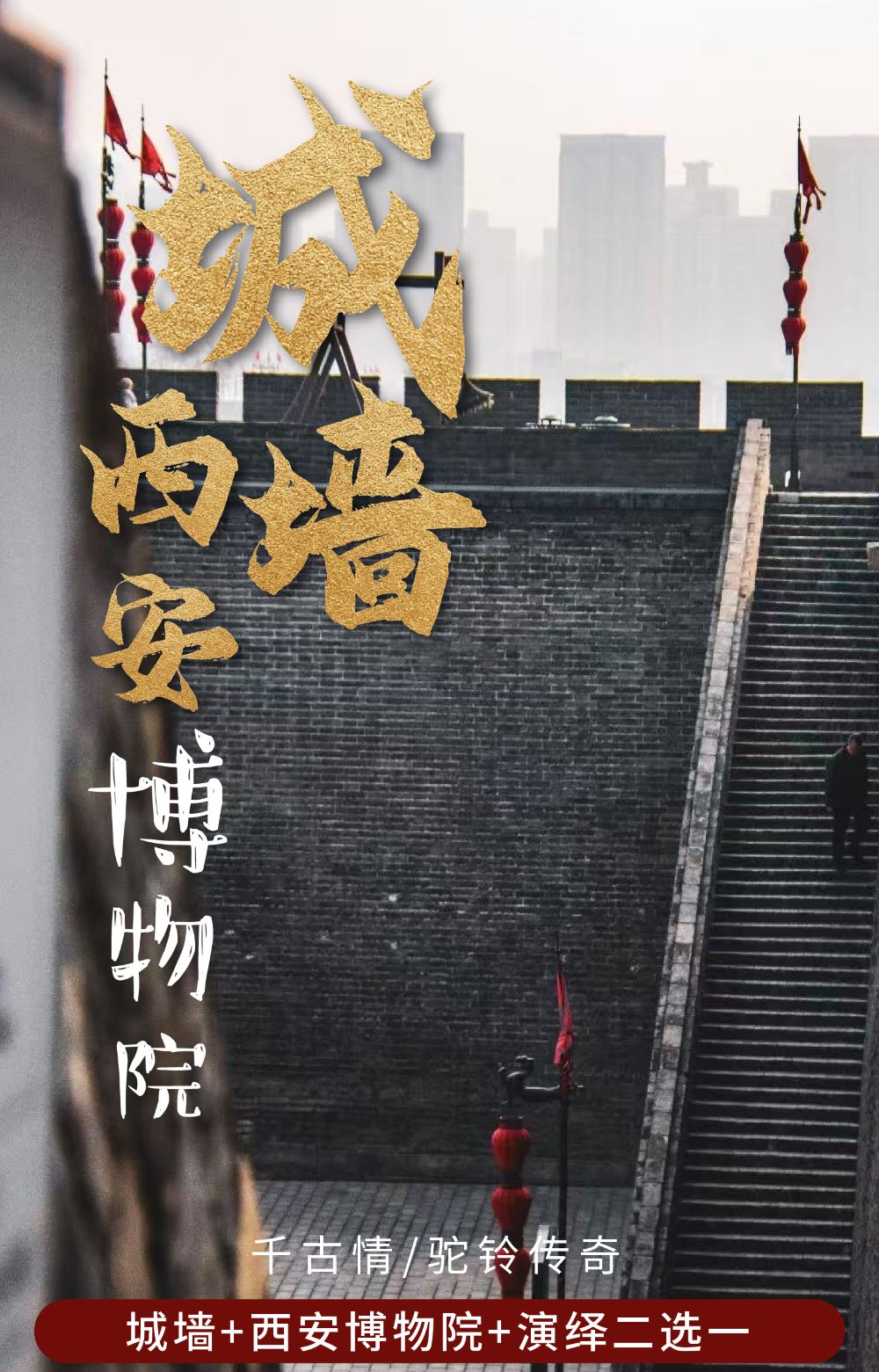 城墙+西安博物院(含入园+讲解耳麦)+千古情或驼铃传奇演出【[古都遗韵,视听盛宴]骑城墙、探西博宝藏,和孩子一起触摸历史,玩转古今!】