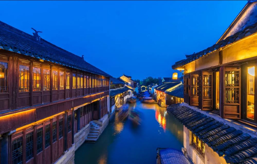 ▲ 周庄是江南闻名于世的水乡古镇,镇上水路纵横,明清老建筑依河而建,画家陈逸飞笔下的双桥刻画出小桥流水人家的温柔,古镇南边的南湖开阔美丽。夜晚周庄亮了灯又别有一番意境。