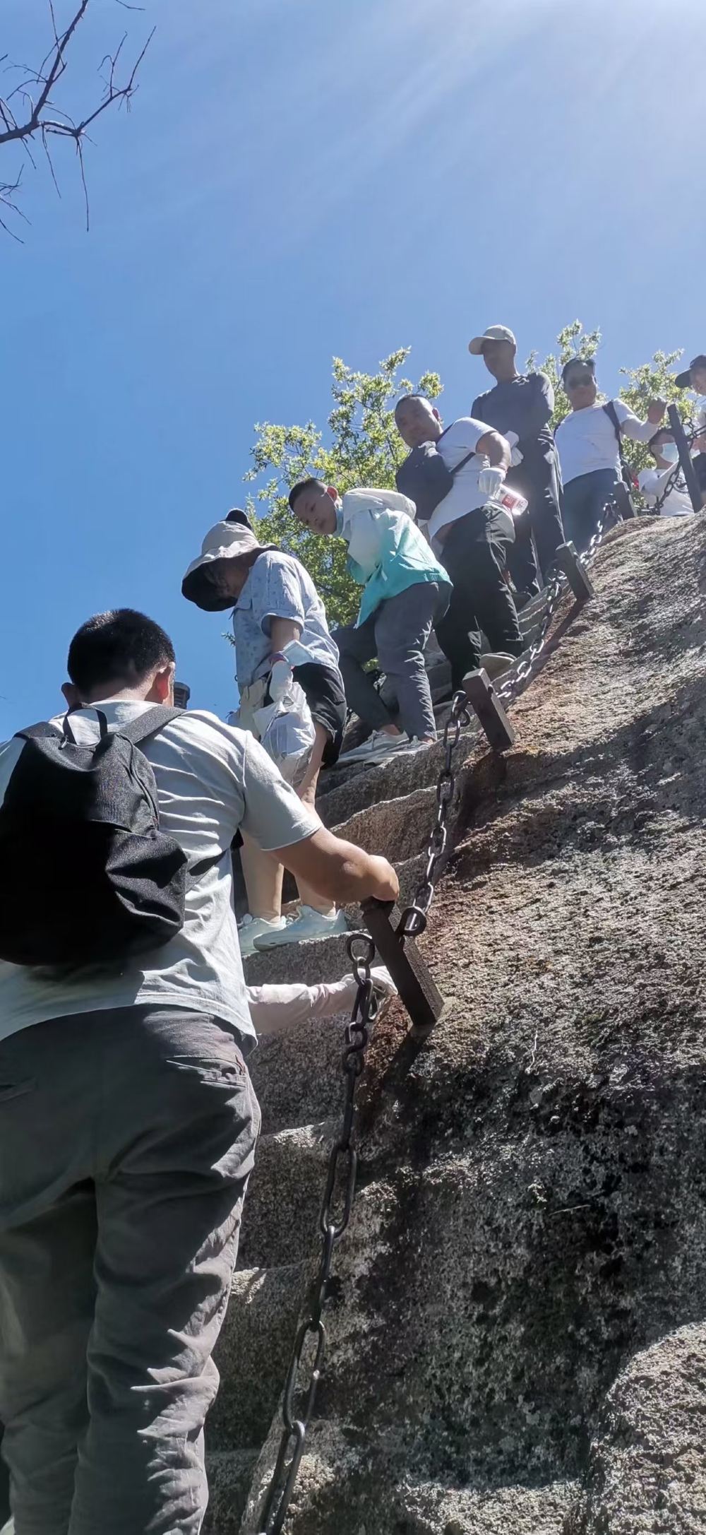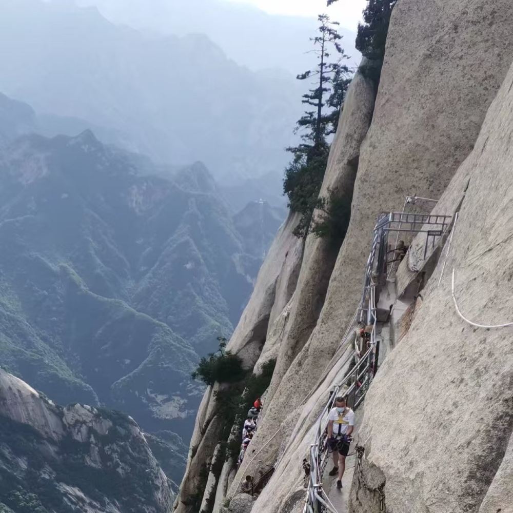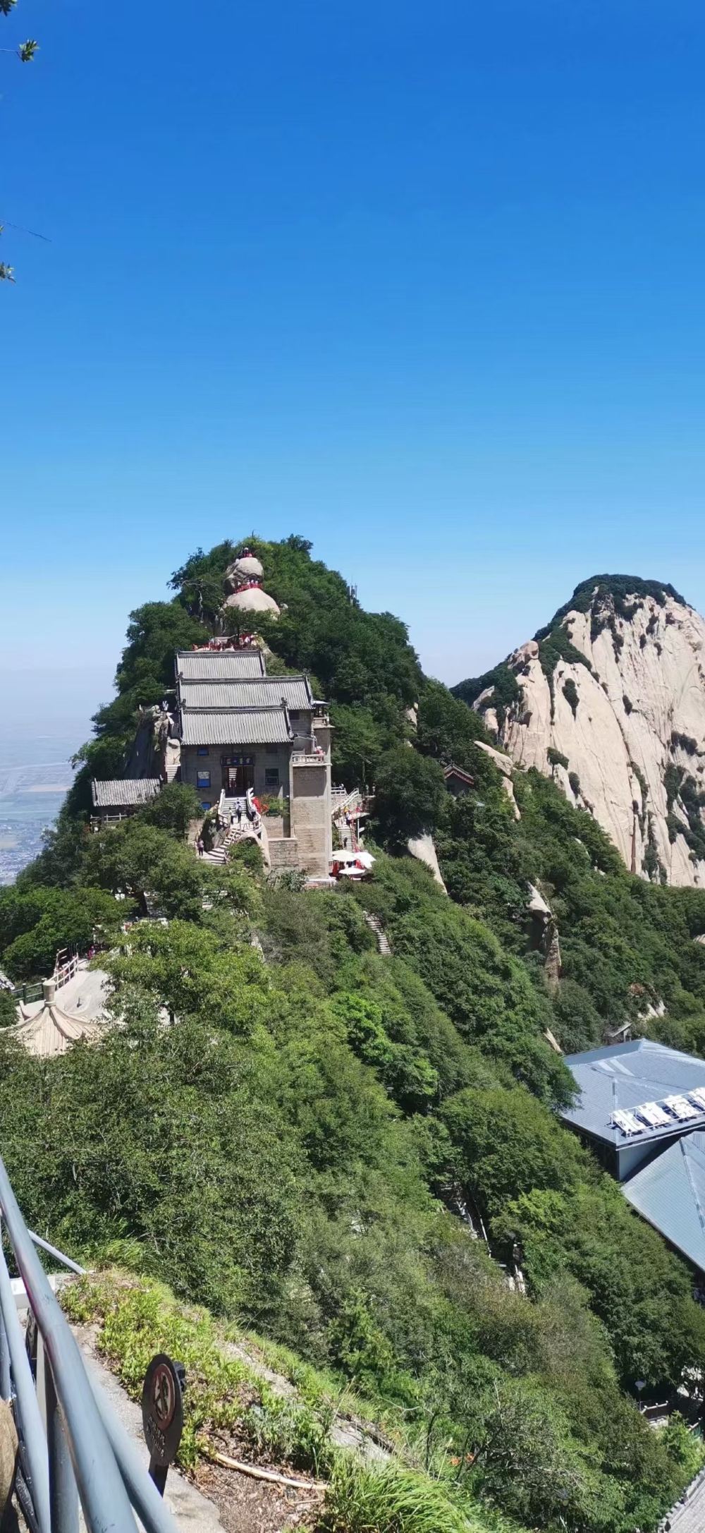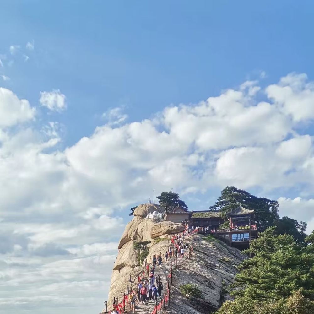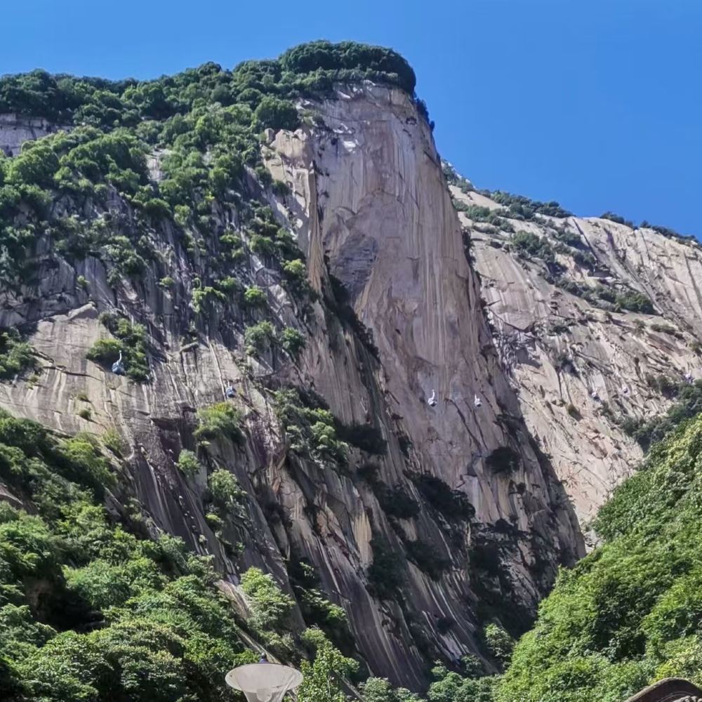 ▲ 晴空裹着秦岭的风,把华山的险揉进翠色里。石阶嵌在云根上,古亭悬在崖腰,连风里都裹着三分“步步惊”的壮阔。红绸绕着栏杆晃,日光撞在石面碎成光斑——这山,是把“奇险”二字,活成了眼底的壮阔。