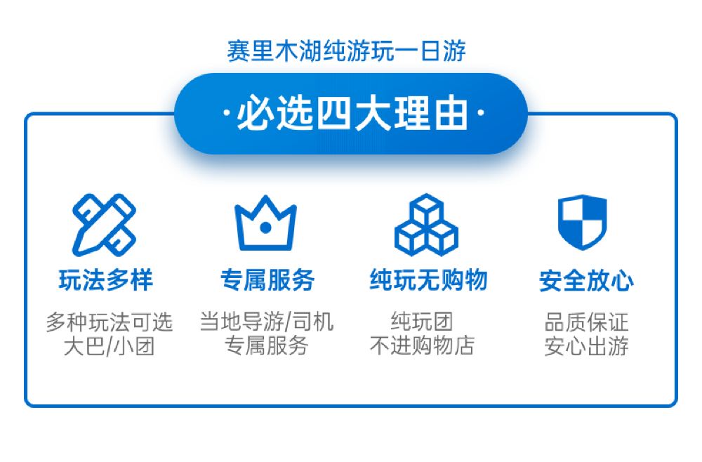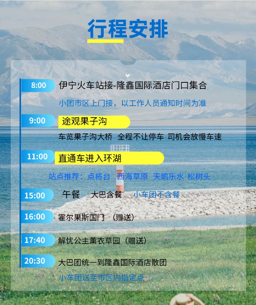 赛里木湖大巴团:游玩赛里木湖+果子沟+霍尔果斯口岸,性价比高,停留三个站点,如想在赛湖多停留,建议选择小团
