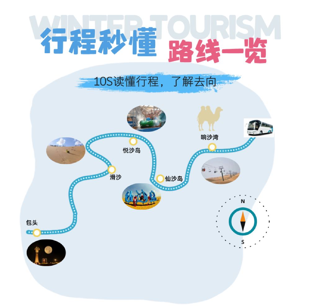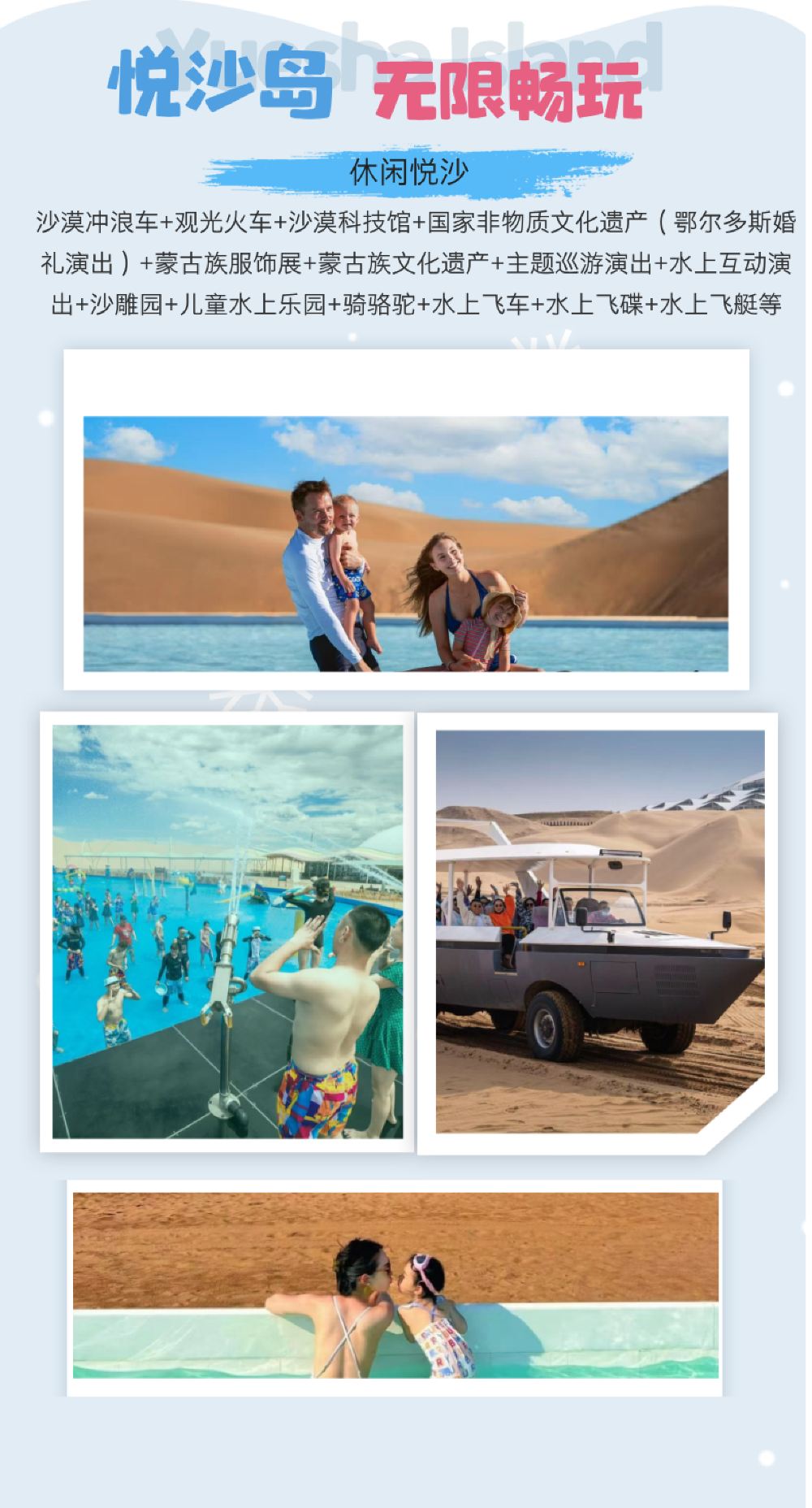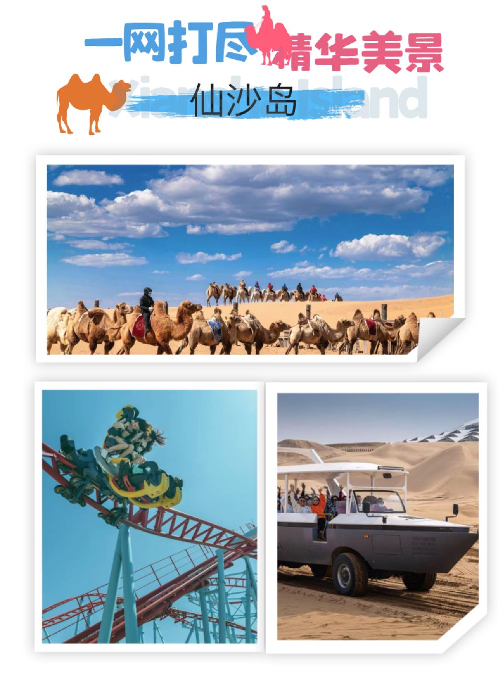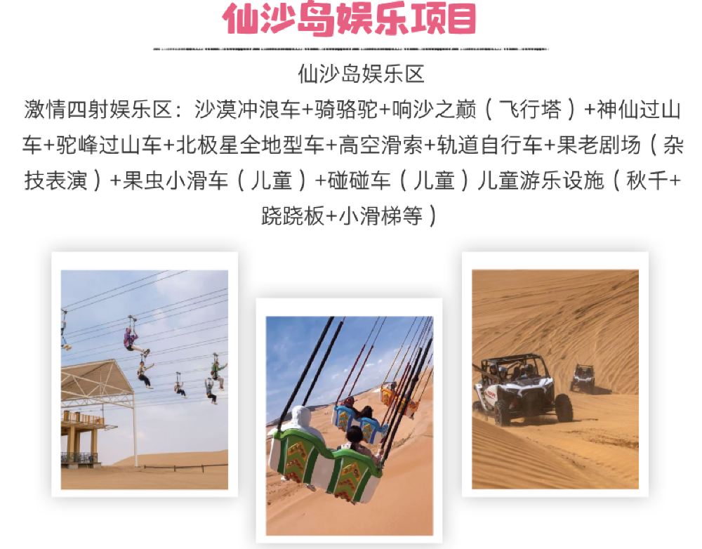 娱乐项目: 沙海游艇、轨道自行车、北极星全地形车、高空滑索、骑骆驼