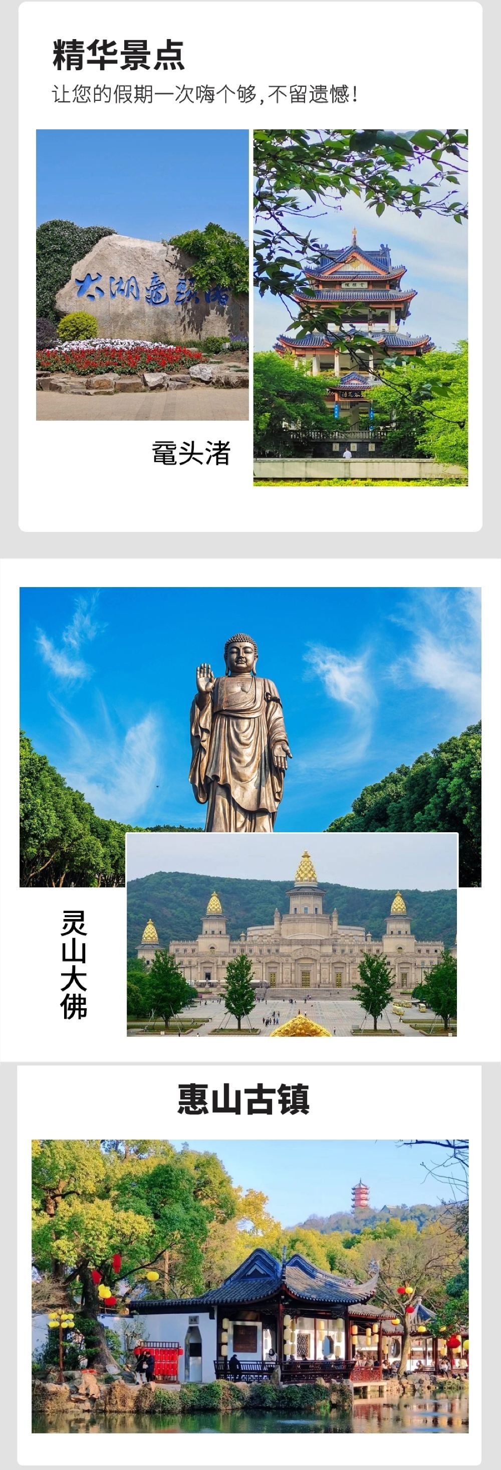 【友情提醒】:如遇恶劣天气景区等其他不可抗力因素园区内游船会在没有预先通知的情况下停航,太湖仙岛行程将无法参观,因为打包门票不予退费,敬请谅解!