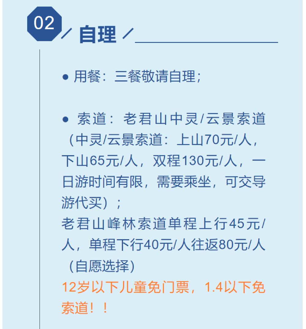 3、假日期间人多,索道排队堵车等,返程时间导游会根据景区实际情况再定,有赶火车高铁飞机的,建议推迟或改期以免造成不必要损失,敬请谅解!