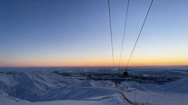 ▲ 缆车线划开粉紫晚霞,远处城郭亮起点点灯火,雪坡在暮色里软成绒毯,风裹着夜凉掠过,是滑完最后一趟、坐在缆车上等星星冒头的温柔