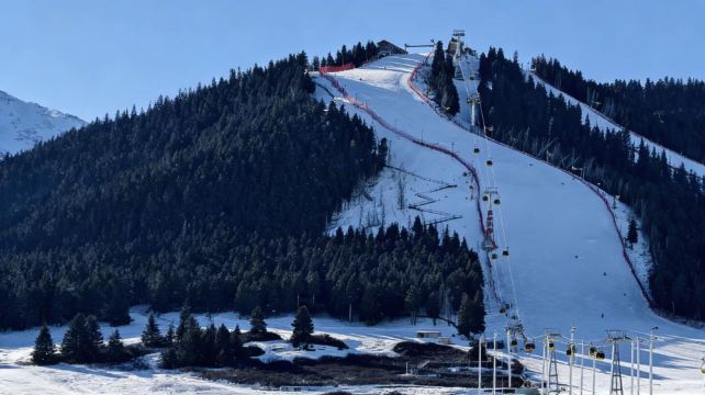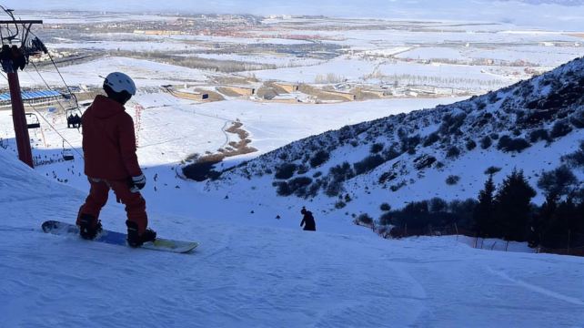 ▲ 红装滑雪者立在雪道顶端,脚下雪坡斜向远处的城,山侧裸岩沾着残雪,零星滑者在雪上扯出细线。风裹着寒意扫过衣摆,是攥紧固定器、预备扎进雪浪里的心跳时刻