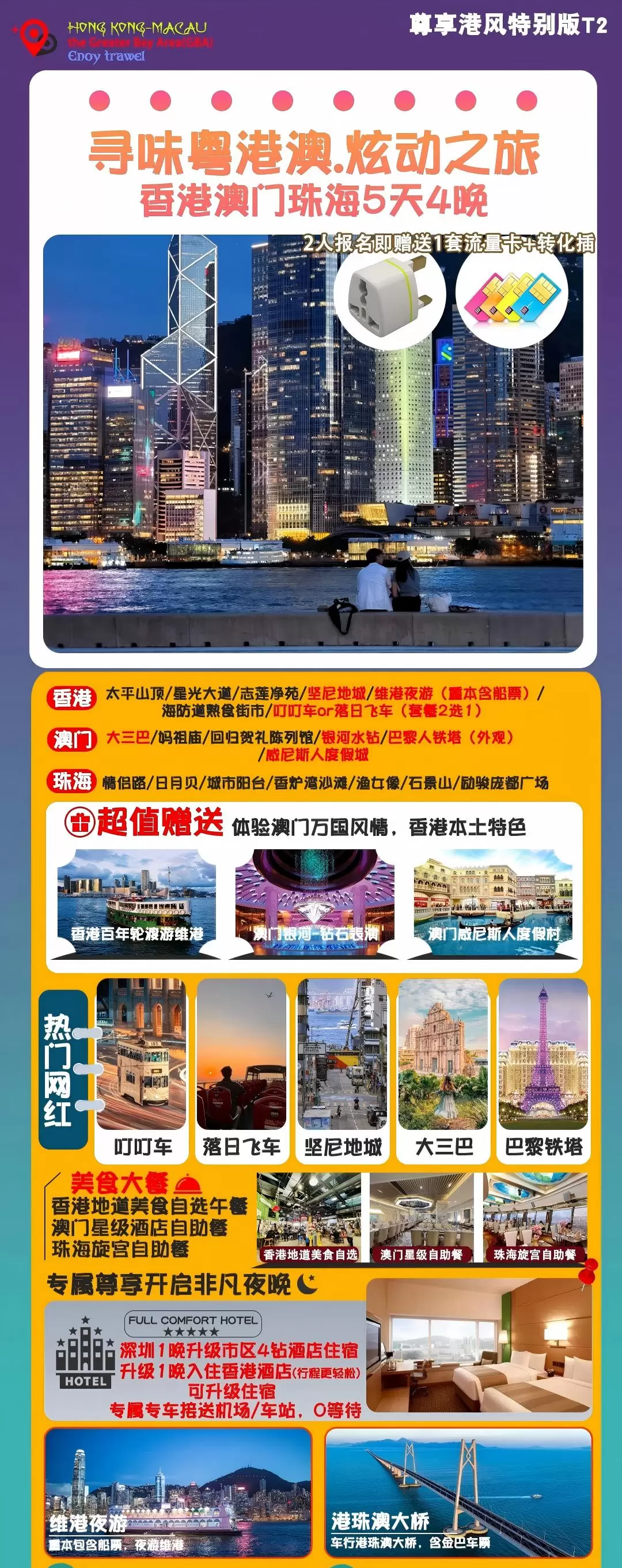 寻味粤港澳.炫动之旅纯玩5天丨含维港夜游船【赠上网卡+接送机丨叮叮车或网红落日飞车环游港岛丨深圳进珠海出】