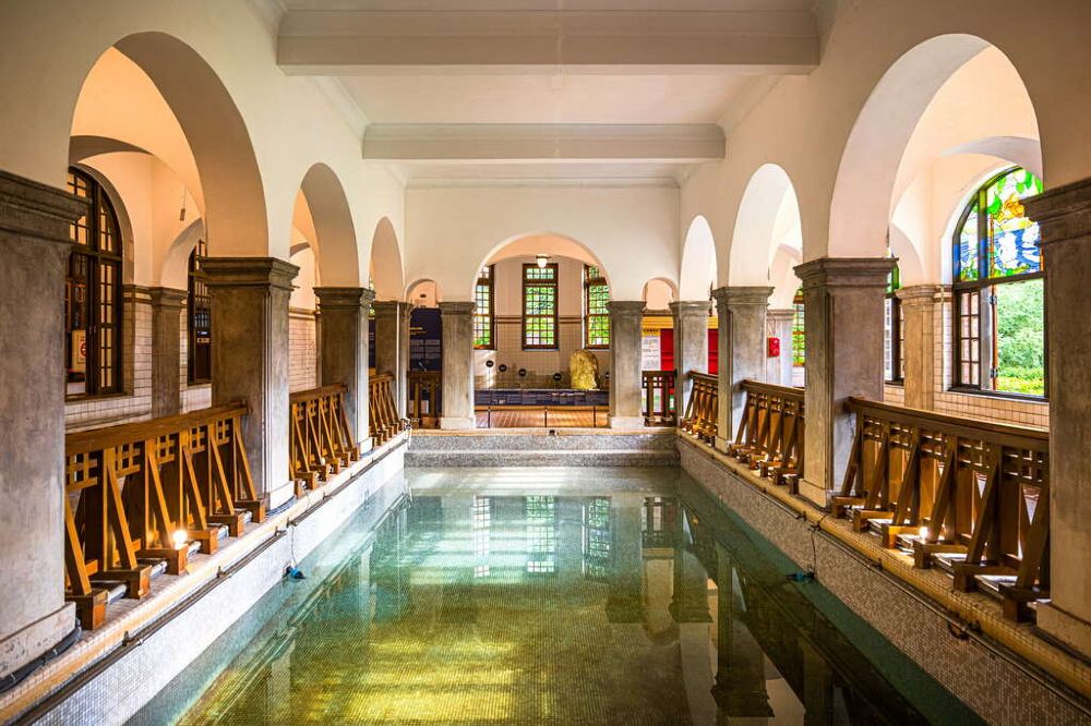 ▲ 北投温泉博物馆 : 这座早在日本时代就享有盛名的温泉公共浴场,有着英国都铎时期的乡村建筑风格,沉稳的红色砖墙与黑色的瓦与绿荫相称,是个让人放松休憩的好地方。 台北市立图书馆书馆是台湾首座绿建筑图书馆,位于北投公园内,与北投温泉博物馆比邻.整个建筑采用环保绿能方式建造,屋顶为轻质生态材质,并设有太阳能光电板发电,绿化屋顶及斜坡草皮可自然排水至雨水回收槽。