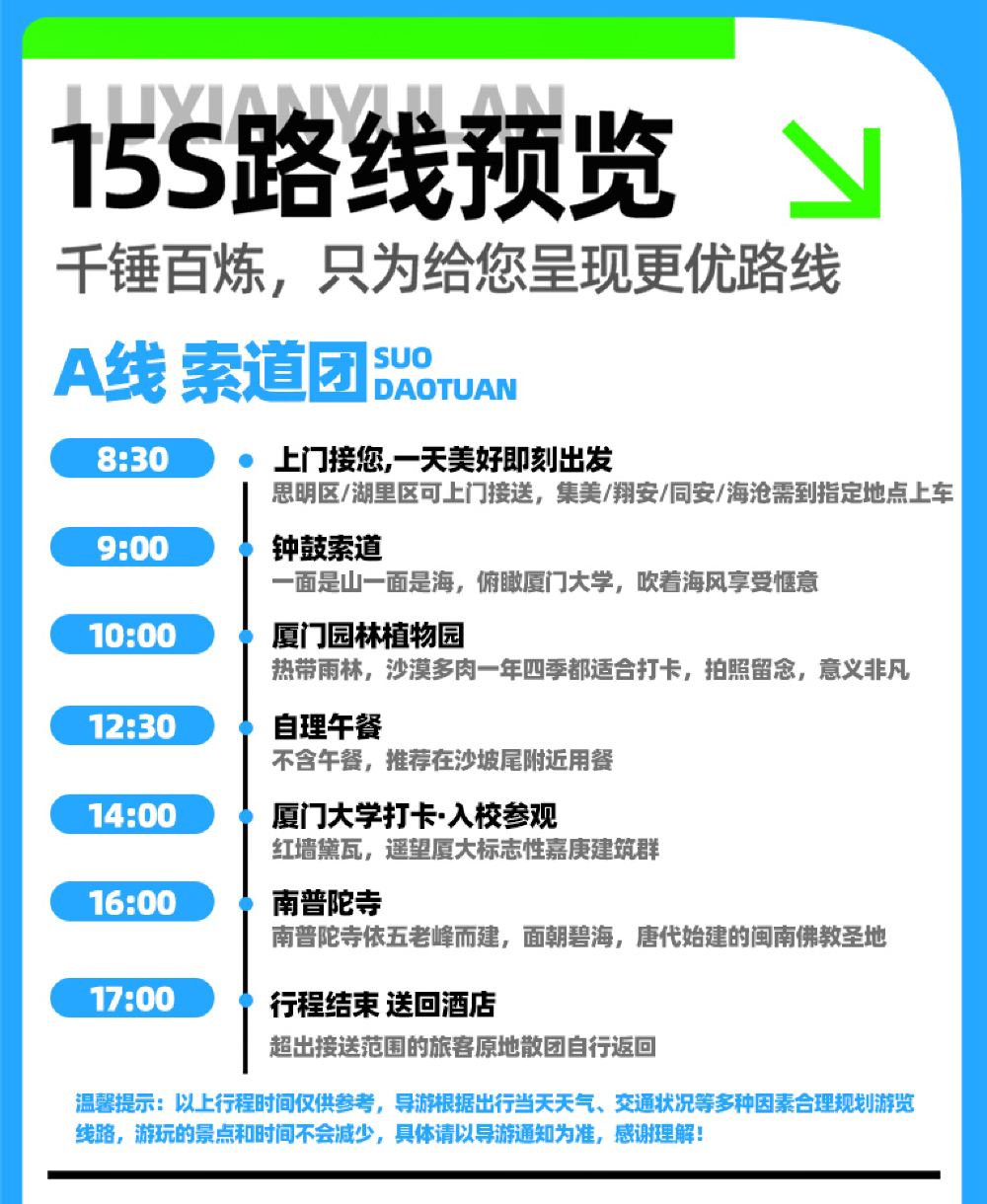 ●【温馨提示】五一、国庆、春节、暑期期间因人流量较大,集合时间可能会提前30分钟左右,具体以工作人员安排通知为准,敬请理解!