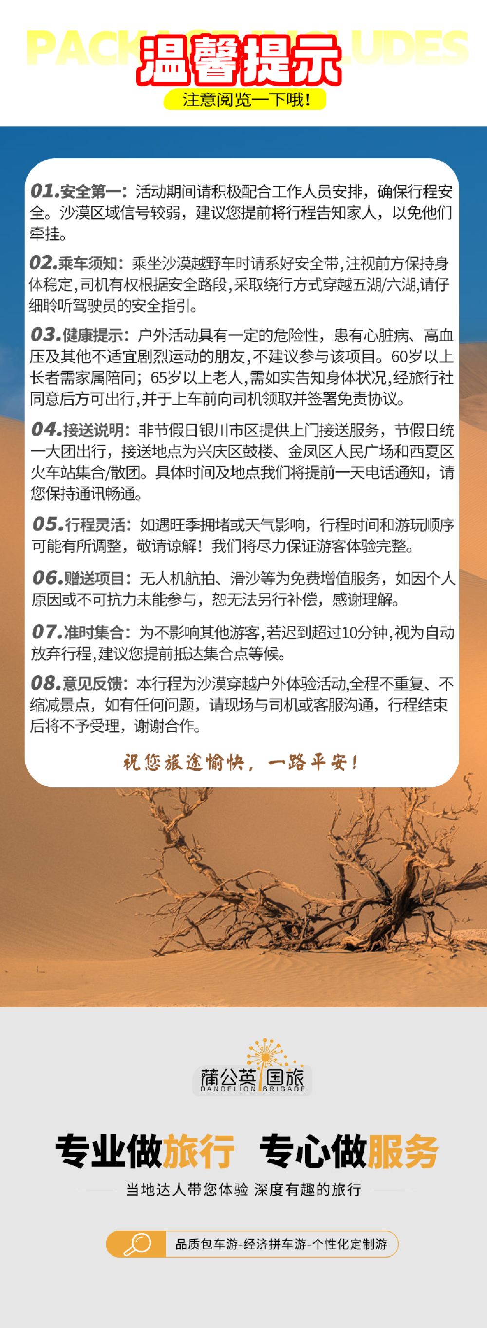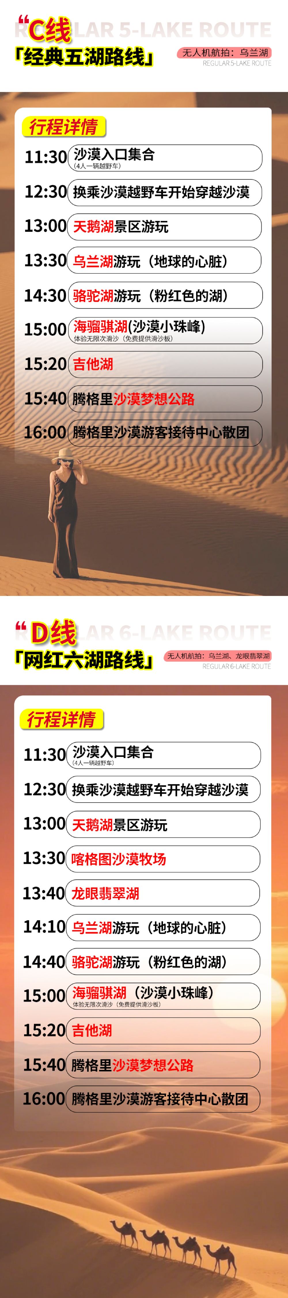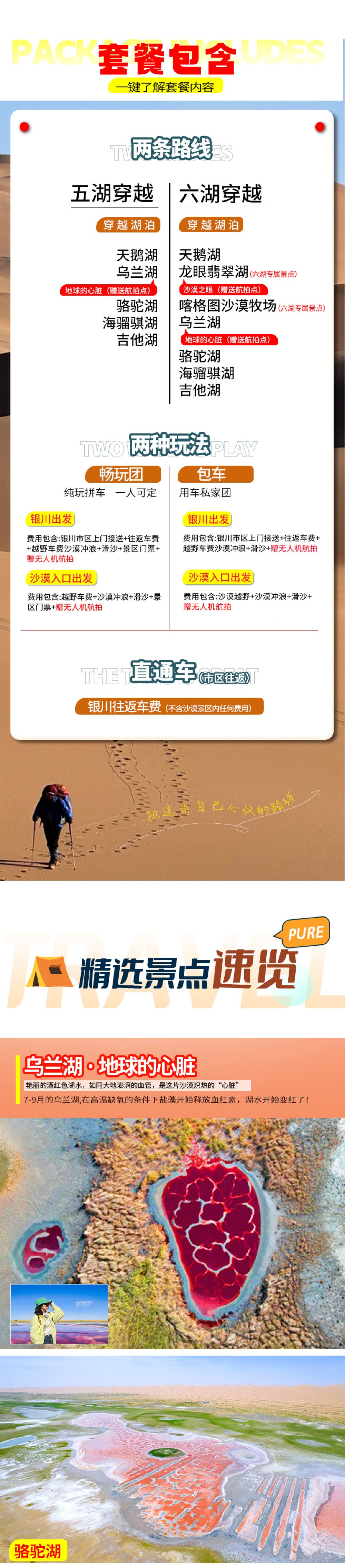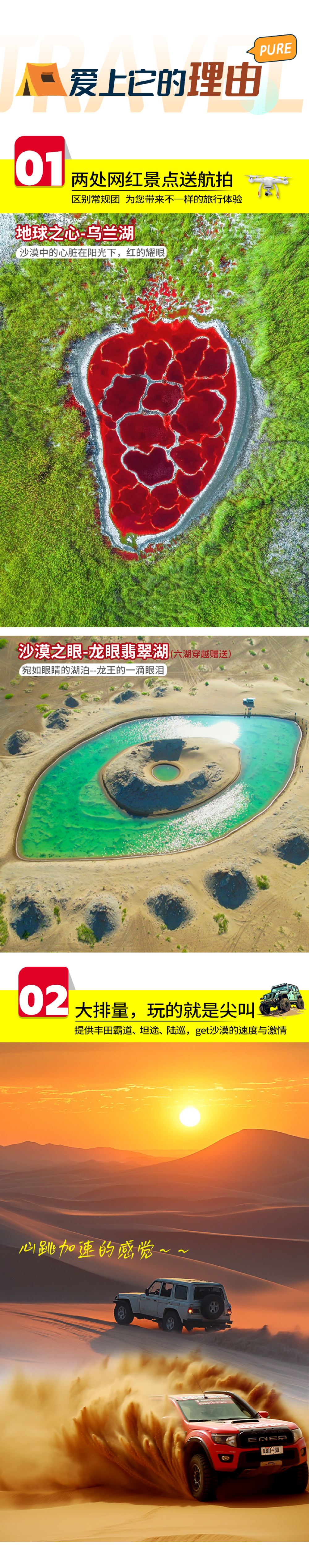 【五湖穿越专线】腾格里沙漠+乌兰湖+龙眼翡翠湖一日游/赠航拍【[可升级六湖穿越]乌兰湖、天鹅湖、骆驼湖、海溜淇湖、吉他湖、龙眼翡翠湖】