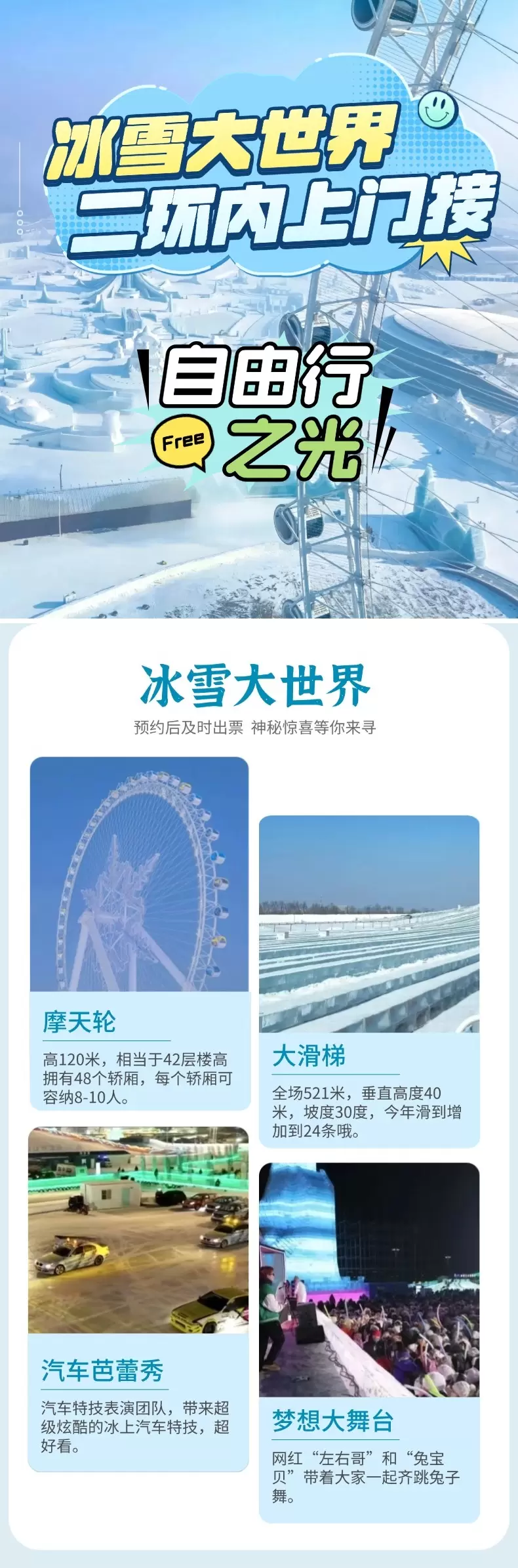 预定须知:本产品为单程车(只含二环内上门送到冰雪大世界门口+冰雪大世界普通门票),不含回程车,回程建议您乘坐地铁。