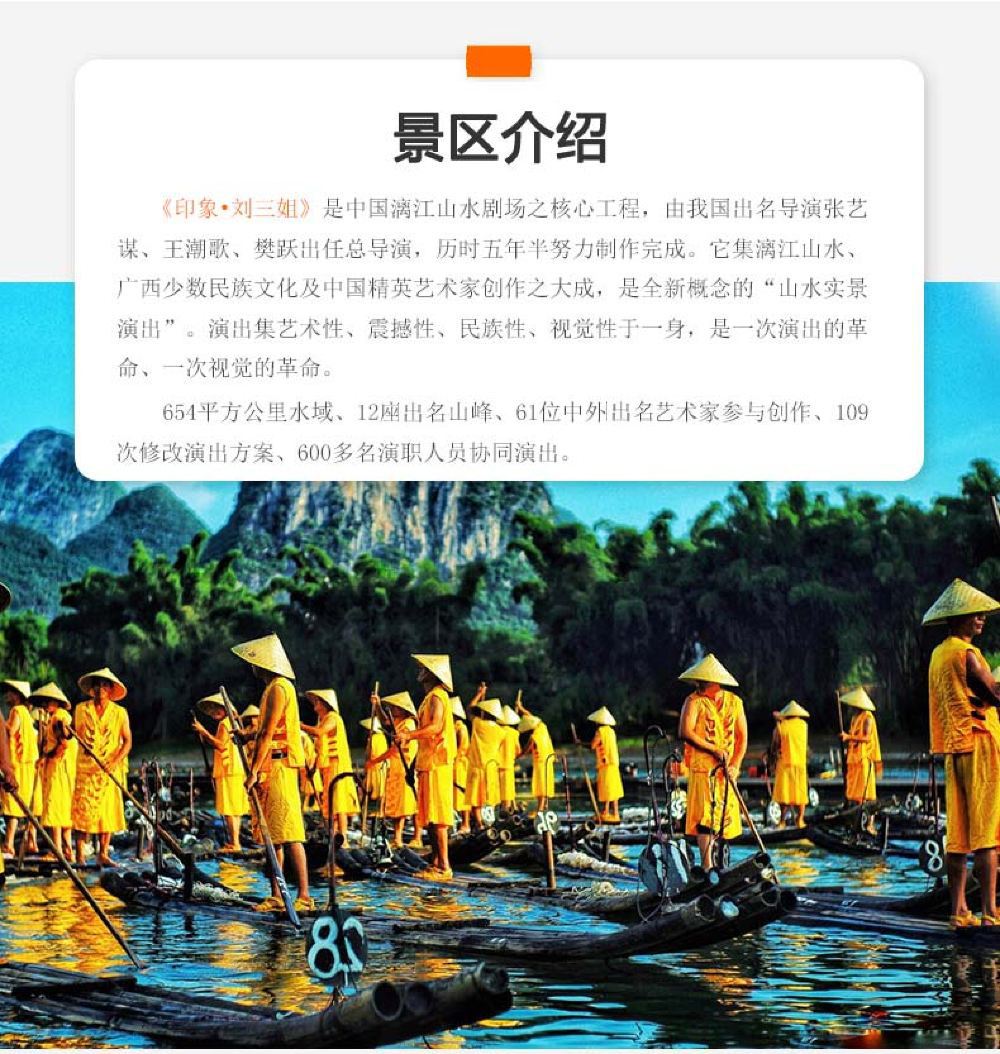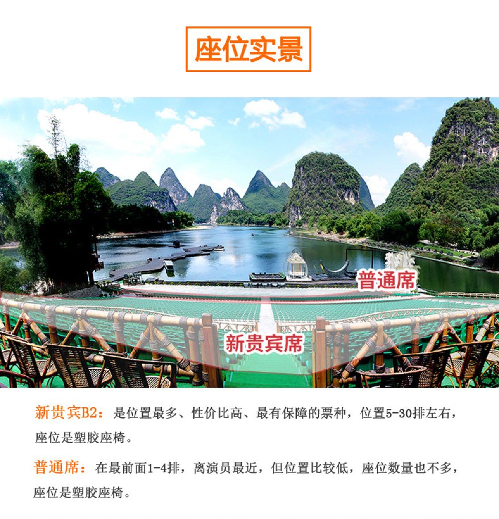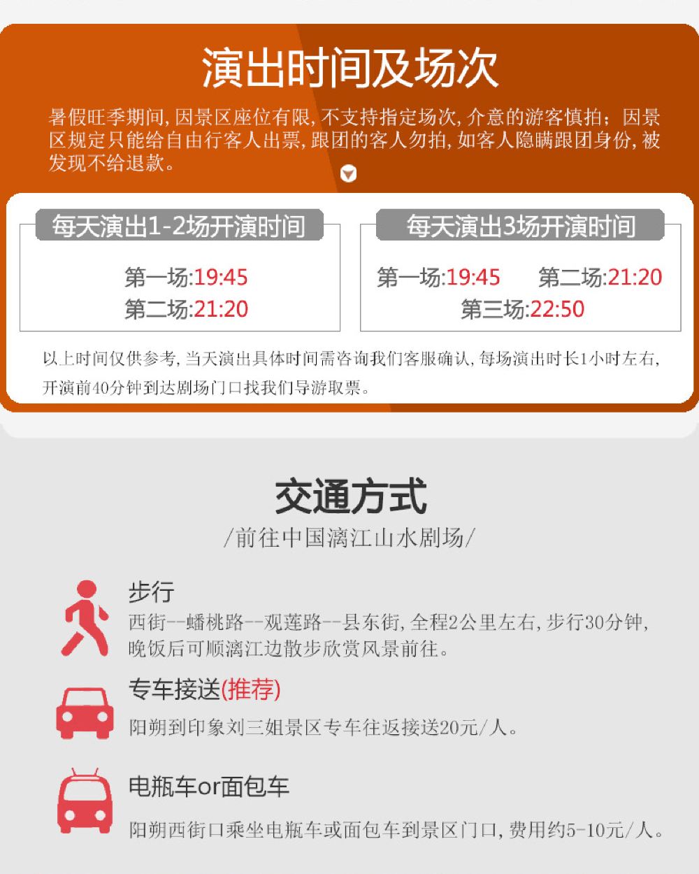 温馨提示:五一、国庆、元旦、春节期间,因用车紧张,所以阳朔暂停接送服务,请自行前往印象景区!