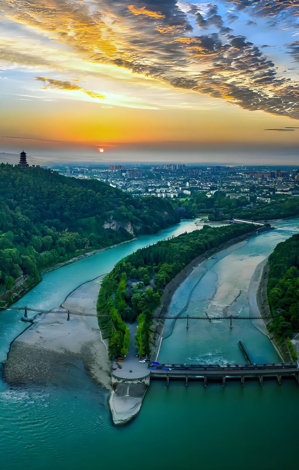 ▲ 都江堰位于四川都江堰市城西,坐落在岷江出山口。它由李冰父子于战国时期主持修建,其鱼嘴、飞沙堰、宝瓶口三大主体工程,至今仍发挥着防洪、灌溉等重要作用。