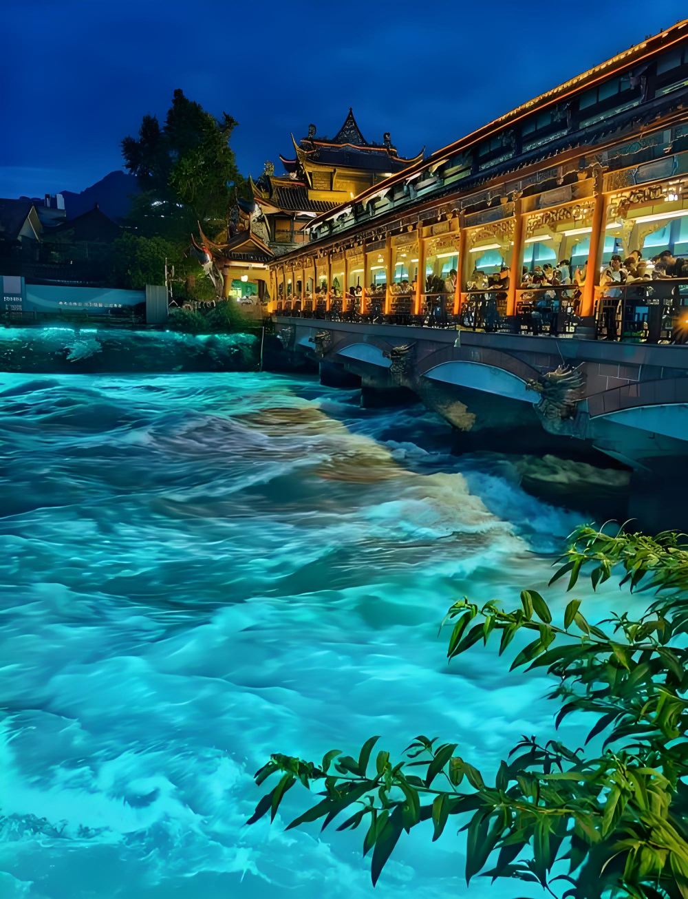 ▲ 夜幕下的都江堰南桥,霓虹闪烁,与岷江江水相互映衬,呈现出梦幻的 “蓝眼泪” 景观。桥身的雕梁画栋、民间彩塑在灯光照耀下美轮美奂,宛如一座璀璨的 “水上画楼”,吸引着众多游客驻足观赏、拍照留念。