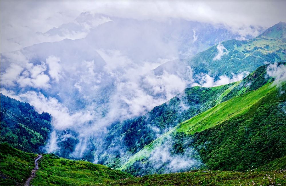▲ 随着海拔的攀升,后半程海拔从3300米来到3950米,坡度逐渐增大,但眼前的景色也愈发震撼。连绵的山峰一座接着一座,高山草甸像一块巨大的绿色绒毯铺展开来,五颜六色的野花星星点点地散布其中,宛如一幅天然的织锦。远处的雪山在云雾中若隐若现,圣洁而庄严,仿佛是大自然神圣的守护。