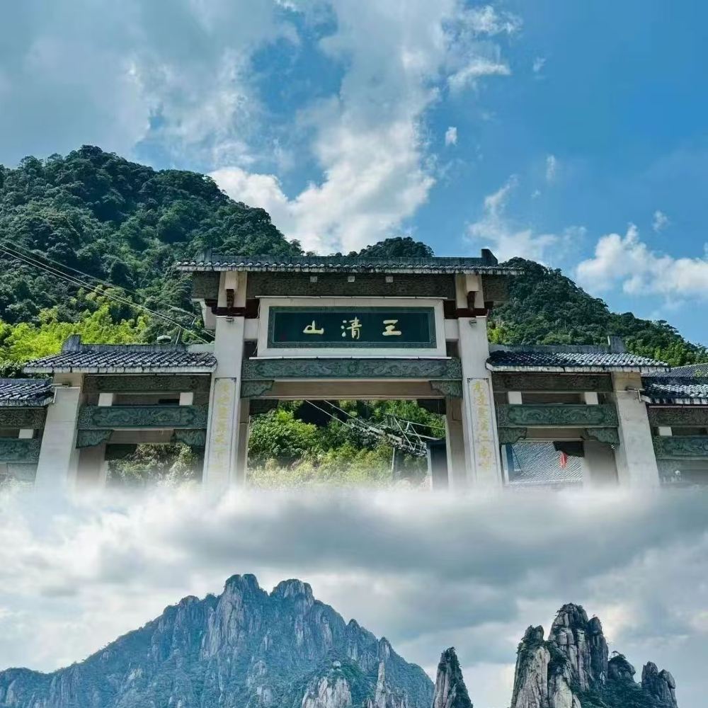▲ 上方,古雅的“三清山”牌坊在葱郁山峦的环抱下,于澄澈蓝天与棉絮般白云的映衬中,尽显古朴庄重,仿佛是通往仙山秘境的门户;下方,奇峰怪石林立,陡峭的山岩似鬼斧神工雕琢而成,苍劲的松树扎根于山石之间,云雾在山间缭绕,给巍峨的山体蒙上一层朦胧的仙气,整体景致既具雄浑的山岳之美,又有灵动的云雾之韵,宛如一幅浑然天成的山水墨卷,将三清山的奇、秀、幽、玄展现得淋漓尽致。