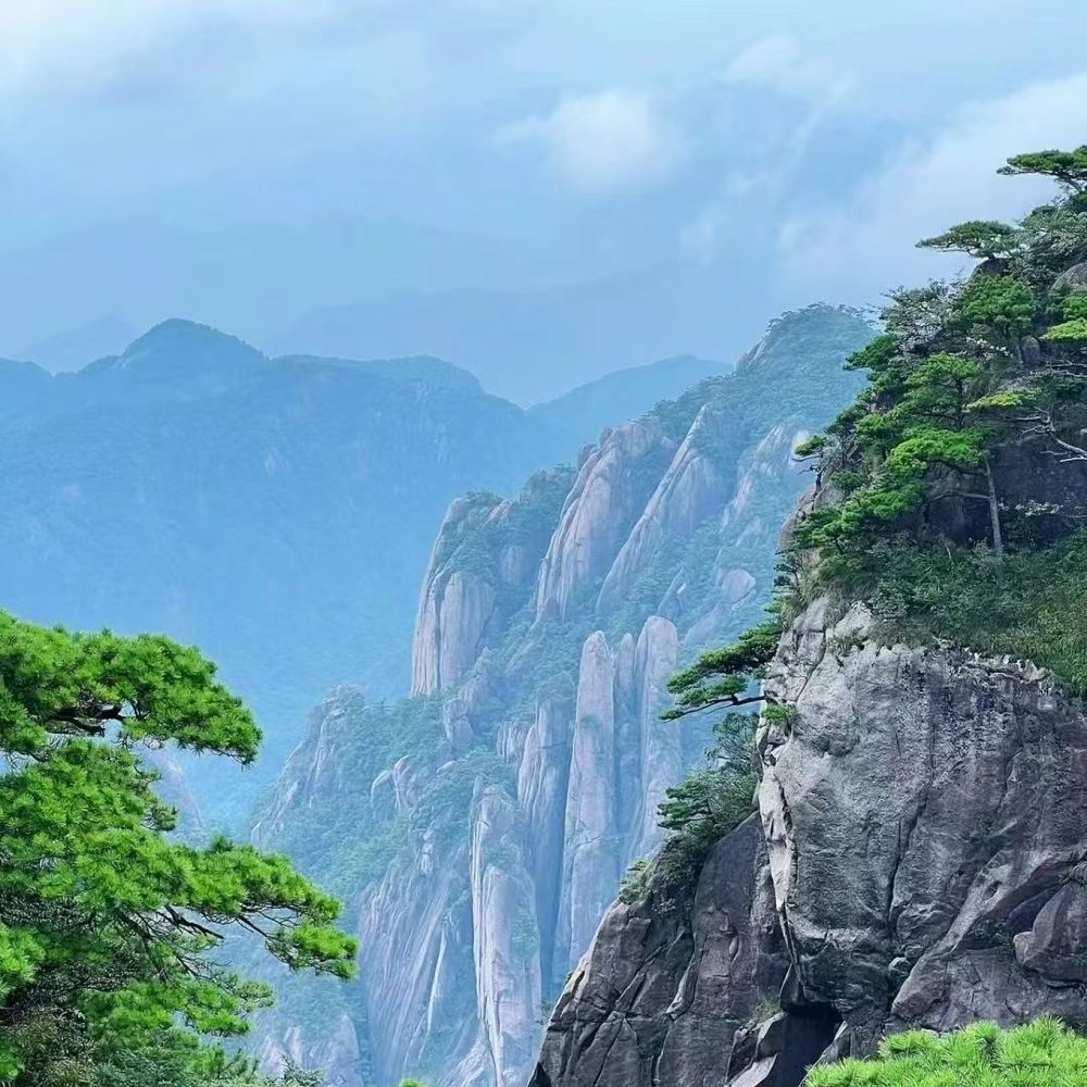 ▲ 远处的山峦在薄雾中晕染开淡蓝的轮廓,与近景的嶙峋山石、葱郁林木层次分明。阳光轻洒,给每一处岩石的纹理、每一片松针的脉络都镀上了柔和的光边,整个画面既有着奇峰怪石的雄浑苍劲,又饱含着林木葱茏的灵秀雅致,仿佛一幅立体的山水长卷。