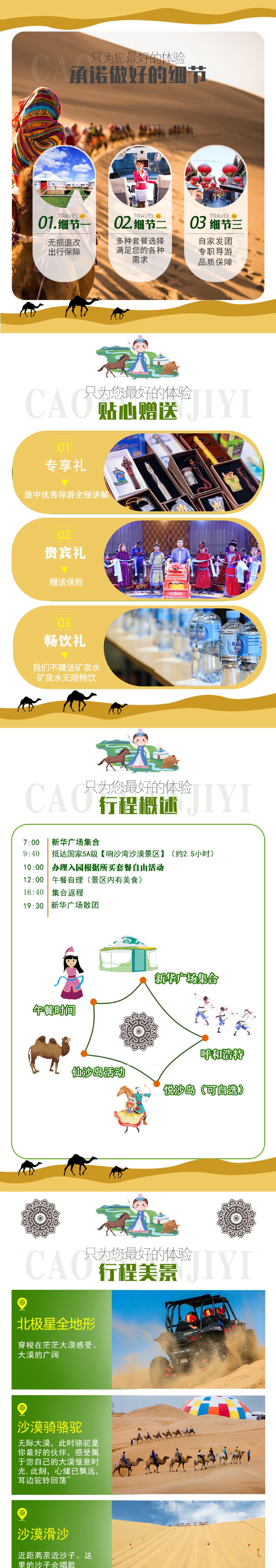 7:00准时发车(出发前一天的20点前导游电话或短信联系游客),车程约2.5小时抵达响沙湾景区。