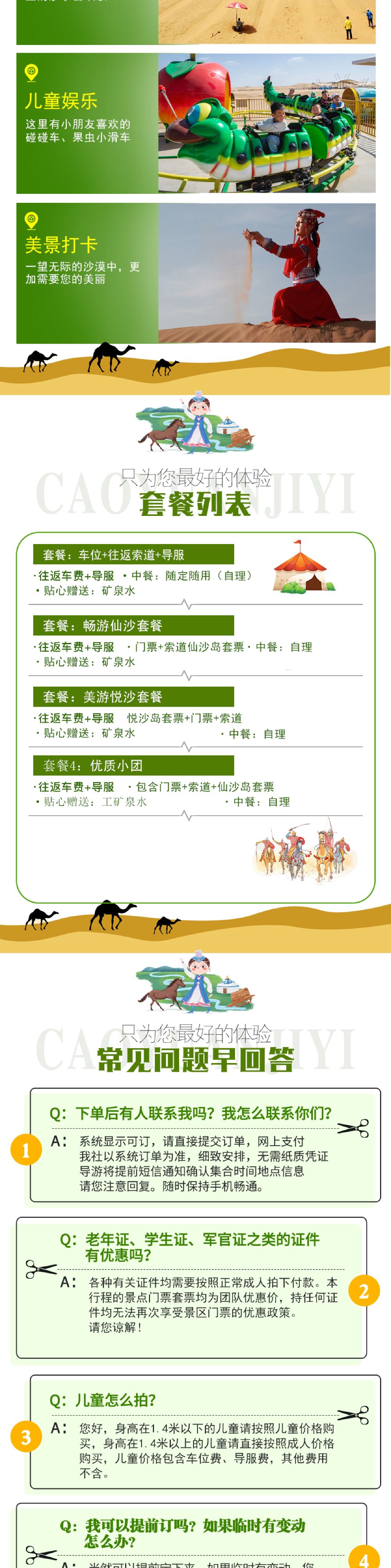 2.神仙过山车、驼峰过山车、响沙之巅、全地形车、高空滑索、骆驼(60以上及年老,体弱或手术身体不适者,心脏病、高血压,醉酒者均不能乘坐)