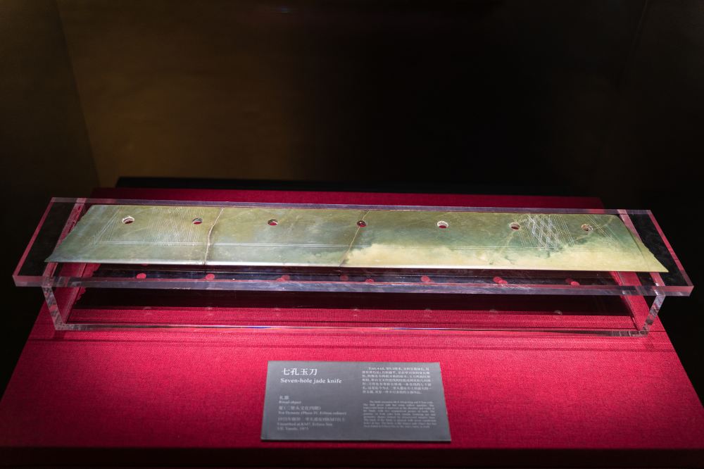 ▲ 二里头七孔玉刀,是夏代玉器工艺的杰出之作。它通体呈墨绿色,扁平长条状,两侧分饰七孔,刃部锋利,背部雕琢精美的阳线纹。作为礼器,它既是权力与等级的象征,又展现了夏代高超的制玉技术,是 “最早的中国” 礼制文明与工艺水平的双重见证。