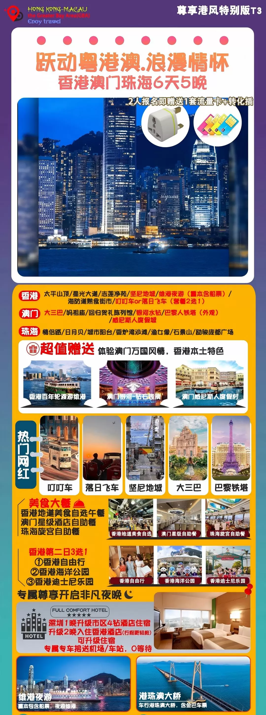 跃动粤港澳·浪漫情怀纯玩6天丨含维港夜游船【赠上网卡+接送机丨叮叮车/落日飞车/海洋公园/迪士尼丨深进珠出】