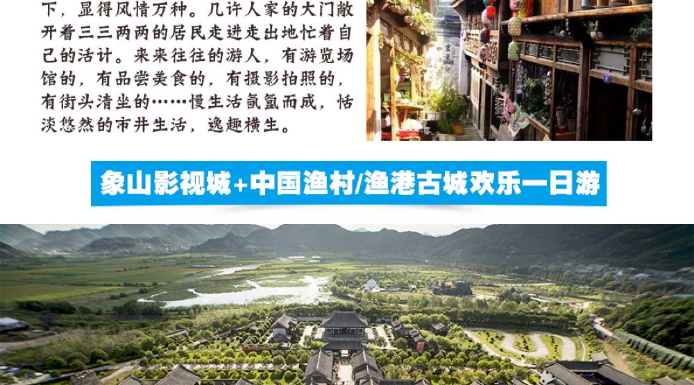 早上宁波7:30海曙农工商/8:00江东体育馆集合出发,车赴“东方不老岛、海山仙子国”之美誉的象山(车程约1.5小时),沿途欣赏美丽的半岛风光、途经象山港大桥。约9:30抵达国家AAAA级旅游景区、中国十大影视拍摄基地—象山影视城+民国城(150元/人,游览时间不少于3小时),看《琅琊榜》、《芈月传》、《太子妃升职记》、《三生三世十里桃林》游象山影视城,参观游览武侠天地(秀丽幽雅归云庄、迷离奇幻绝情谷)、玄幻世界(美仑美奂西游记乐园、田园风光陆家庄)、江湖小镇(参观刀光剑影襄阳城),漫步襄阳城南渡桥,能否偶遇三生三世的那对情侣,置身宏伟富丽的皇宫(洗梧宫),享受仙宫境遇,飞奔至云集茶楼,找寻白浅上神和太子夜华的身影,身临十里桃林、青丘狐狸洞(水帘洞)亲身体验逍遥人生。体验中国实景电影主题乐园,带您“穿越”大宋朝,观看魔幻剧场励志剧、影视梦工场体验杨过小龙女过戏瘾、天地英雄实景影视武侠剧、绝活绝技展演、佤族歌舞等经典剧目、品影视美食、穿越影视时光隧道;亲身体验电影声音合成制作;随后游览《琅琊榜》拍摄地—星梦工场(大理皇宫、桃园行宫、靖王府、苏宅、私炮房、古战场),体验影视片场探班之旅,《琅琊榜》曲终人不散,快来象山影视城寻找小殊,回忆与梅郎共度的日子!最后带你带你进入奇妙的民国穿越party,在这里,可以让你一口气感受来自不同地域的民国氛围:走在南京路、中山路、霞飞路、建邺大街等街道上,与军阀警察、卖报童、民国女学生、卖花姑娘不期而遇,沿街陈列的黄包车、叮当车、老式自行车勾起你对于民国年代的无限遐想,城内的民国旗袍秀、百乐门里的歌舞表演等演艺节目更是让你沉浸其中。