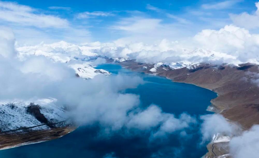 ▲ 航拍视角下呈现出的壮美景观。湛蓝湖水如宝石般镶嵌在大地,周围雪山连绵,峰顶积雪皑皑,白云缭绕山间,似给山川蒙上轻柔薄纱,蓝天作衬,尽显高原湖泊的雄浑与圣洁,勾勒出大自然鬼斧神工的优美画卷 。