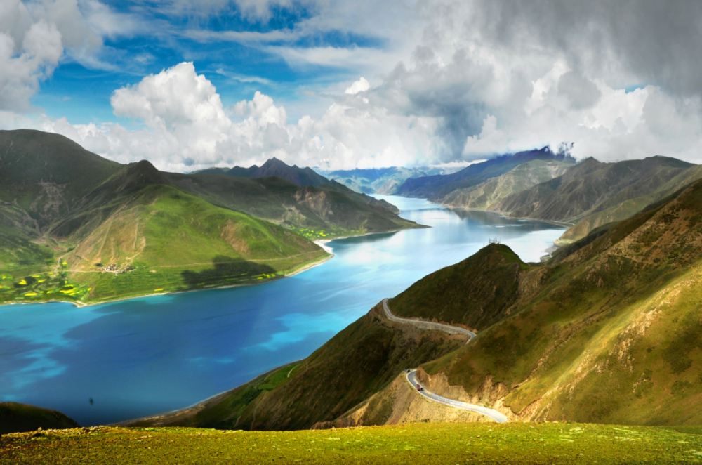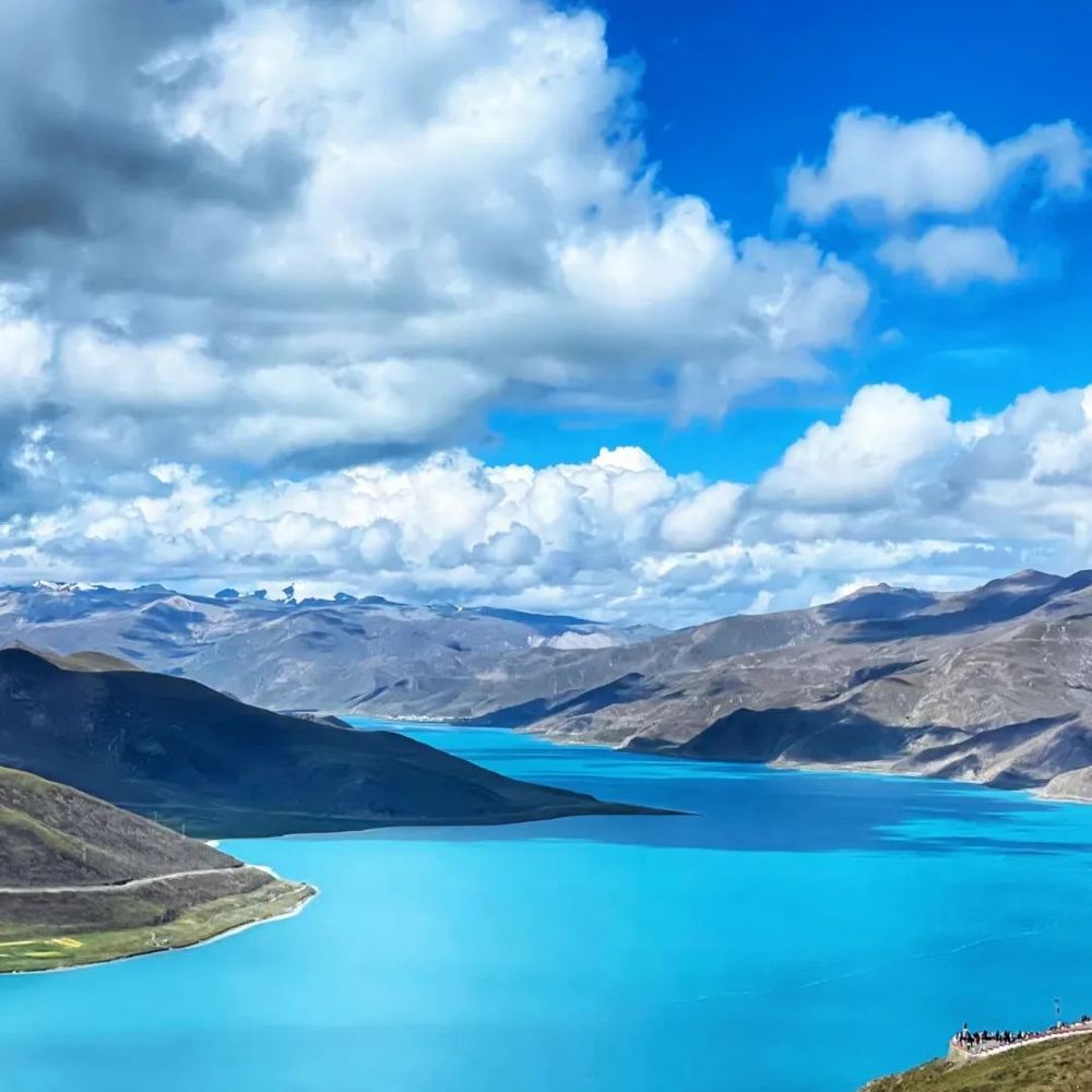 ▲ 这是西藏的羊卓雍错湖(羊湖),湖水呈现出极为迷人的蓝色,在蓝天、白云与连绵山脉的映衬下,显得格外纯净。远处山峦起伏,山顶有积雪,天空中云朵形态各异,光影洒在湖面和山体上,营造出壮阔又静谧的高原湖泊美景,尽显大自然的雄浑与秀丽 。
