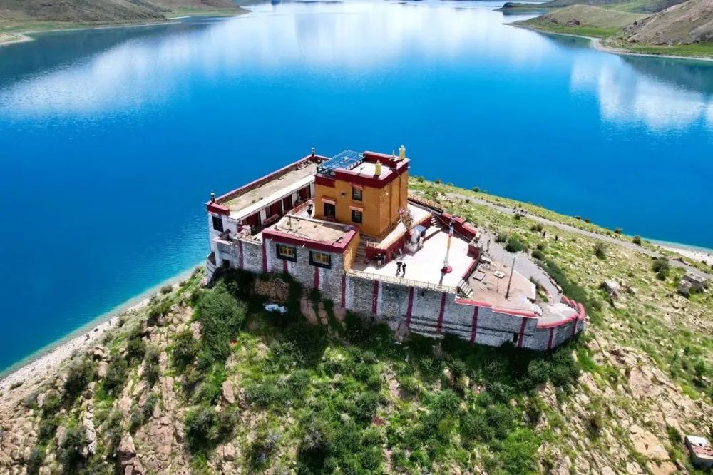 ▲ 日托寺位于西藏自治区山南市浪卡子县,坐落在羊卓雍错(羊湖)西南岸一座孤独的小岛上 ,小岛与湖岸间有狭窄的土地相连,从远处看,日托寺就像是漂浮在羊卓雍错湖面上,遗世独立。寺庙规模较小,建筑紧凑。主体建筑是一座上下两层的白色小楼,外墙装饰有红色、黄色的线条,屋顶为传统藏式风格。内部设有佛堂,供奉着佛像、唐卡等宗教物品,虽然规模不大,但内部的宗教陈设却庄重而精美,充满着浓厚的宗教氛围。羊卓雍错湖水湛蓝清澈,围绕着日托寺所在的小岛,无论从哪个角度看,都是一幅如诗如画的风景。