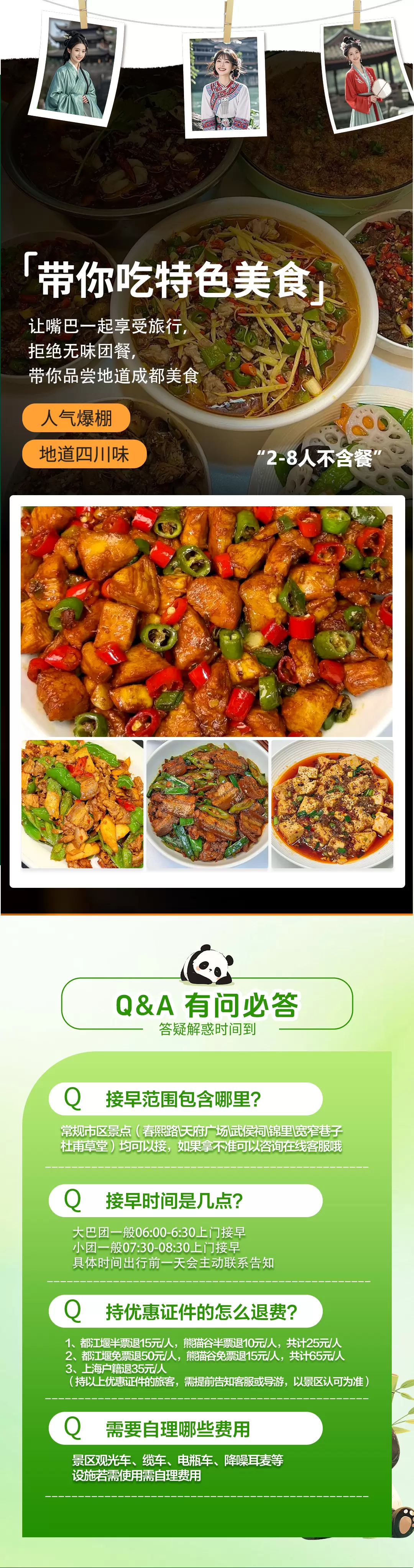 1、2-8人团不含导游、不含餐,由司机/景区讲解员讲解都江堰景区1小时左右,其余景区自行游览。
