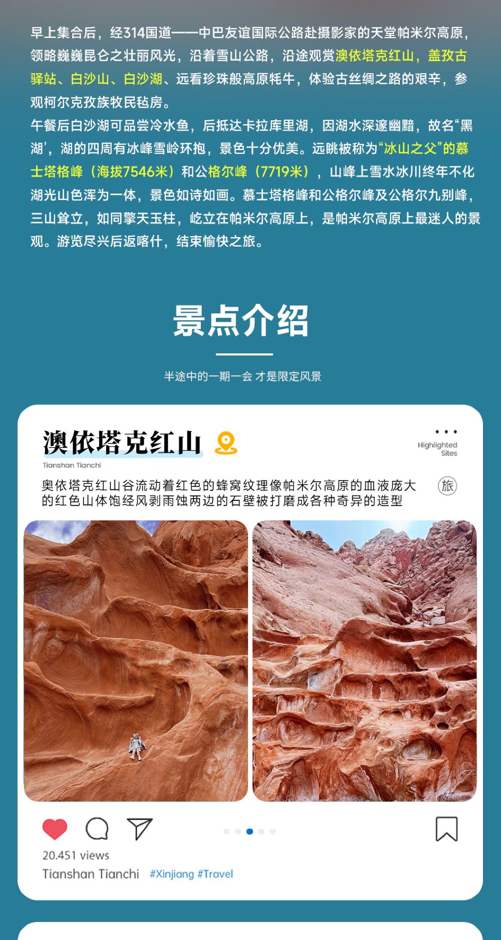 【游览特色】慕士塔格峰、昆仑山脉,是西昆仑山脉第三高峰。慕士塔格峰、公格尔峰、公格尔九别峰,三山耸立,如同擎天玉柱,屹立在美丽的帕米尔高原上,成为帕米尔高原的标志和代表