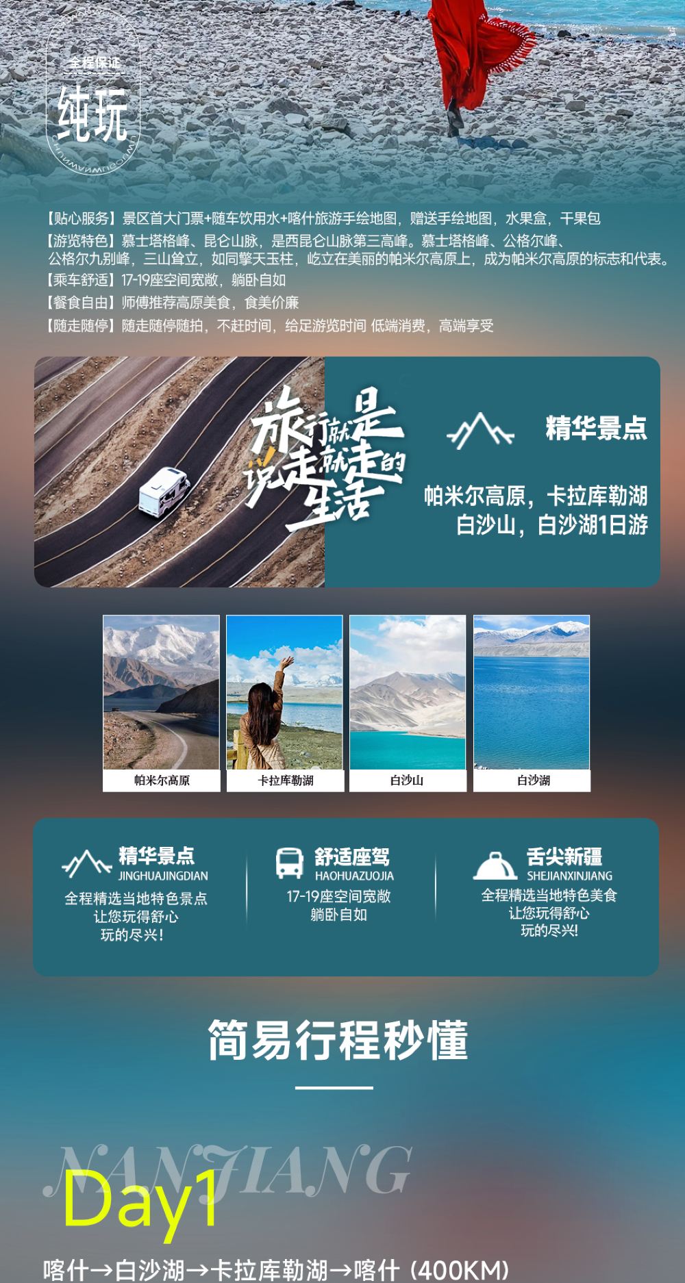 喀拉库勒湖景区+帕米尔高原+白沙山-白沙湖景区一日游【【贴心服务】景区首大门票+随车饮用水+喀什旅游手绘地图】