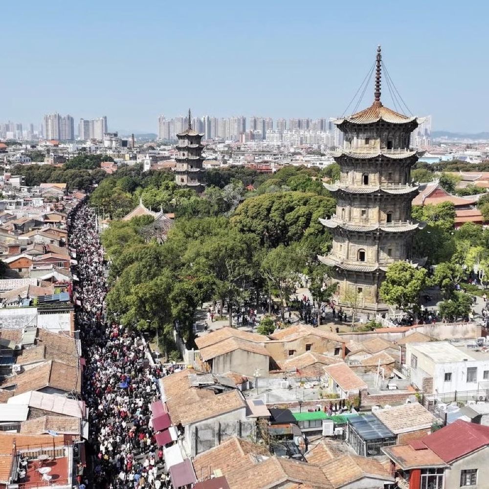▲ 开元寺双塔东为“镇国塔”,高48.27米,始建于唐咸通六年(865年);西为“仁寿塔”,高45.06米,始建于五代梁贞明二年(916年)。开元寺双塔历经风雨侵袭,地震摇撼、仍屹然挺立、表现了宋代泉州石构建筑和石雕艺术的高度成就,成了泉州古城的独特标志和象征。